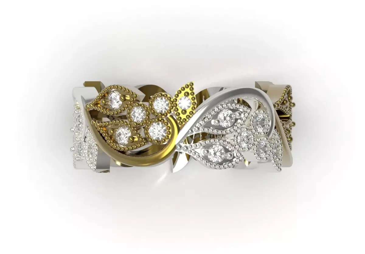 | Features | Details || :--- | :--- || Ring Type | Full-Eternity Band / Wide Band || Design Style | Vintage & Modern, Leaf/Wing Motif Inspired || Suggested Metal | Two-Tone Gold || Manufacturing Method | Casting & Assembly || Key Difference | Combination of contrasting metal sections to create visual depth |