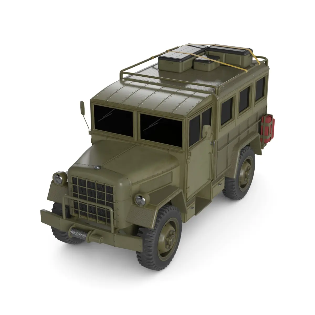 A rugged all-terrain vehicle from the historical timeline, designed for civilian use off-road. This vehicle features a boxy shape with a matte olive green color, complemented by a textured metal exterior. The large, knobby tires provide excellent traction on various terrains, while the spacious interior is equipped with durable fabric seats and a simplistic dashboard layout.