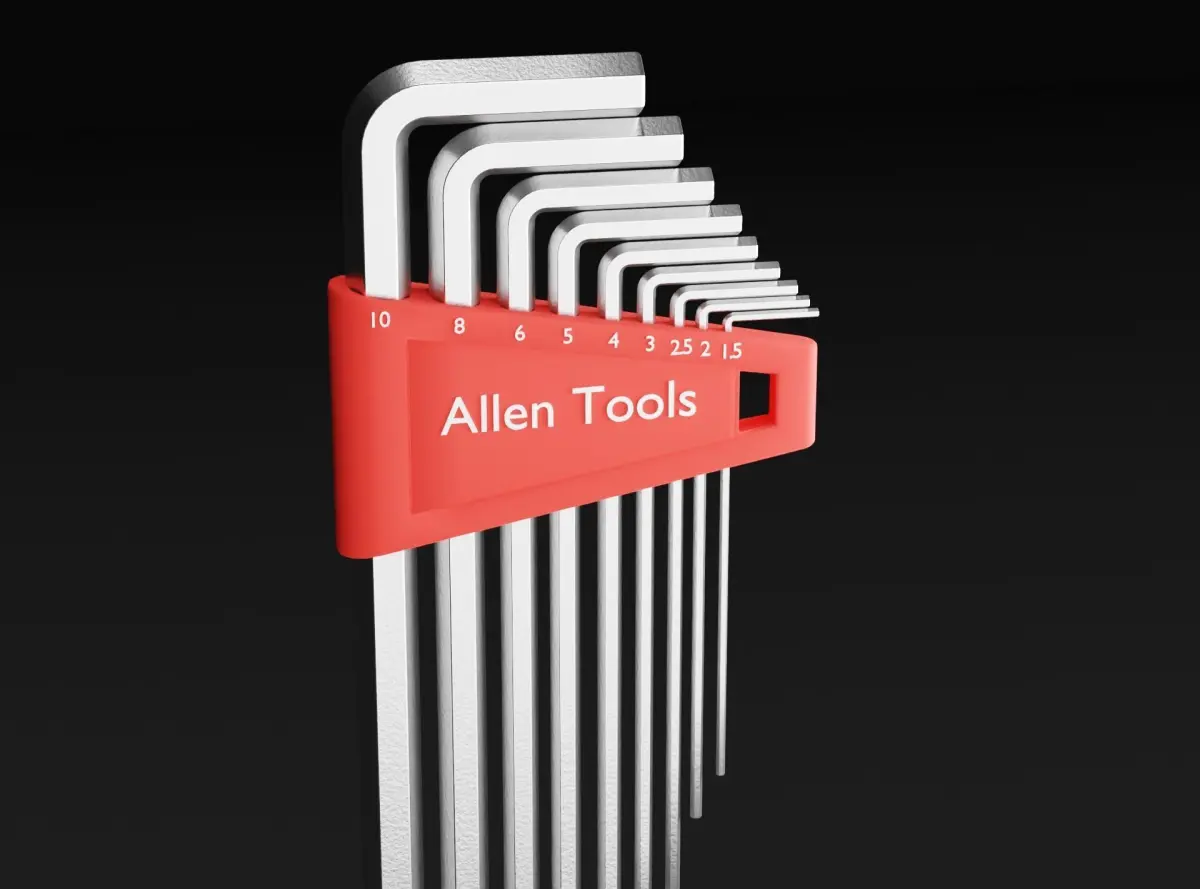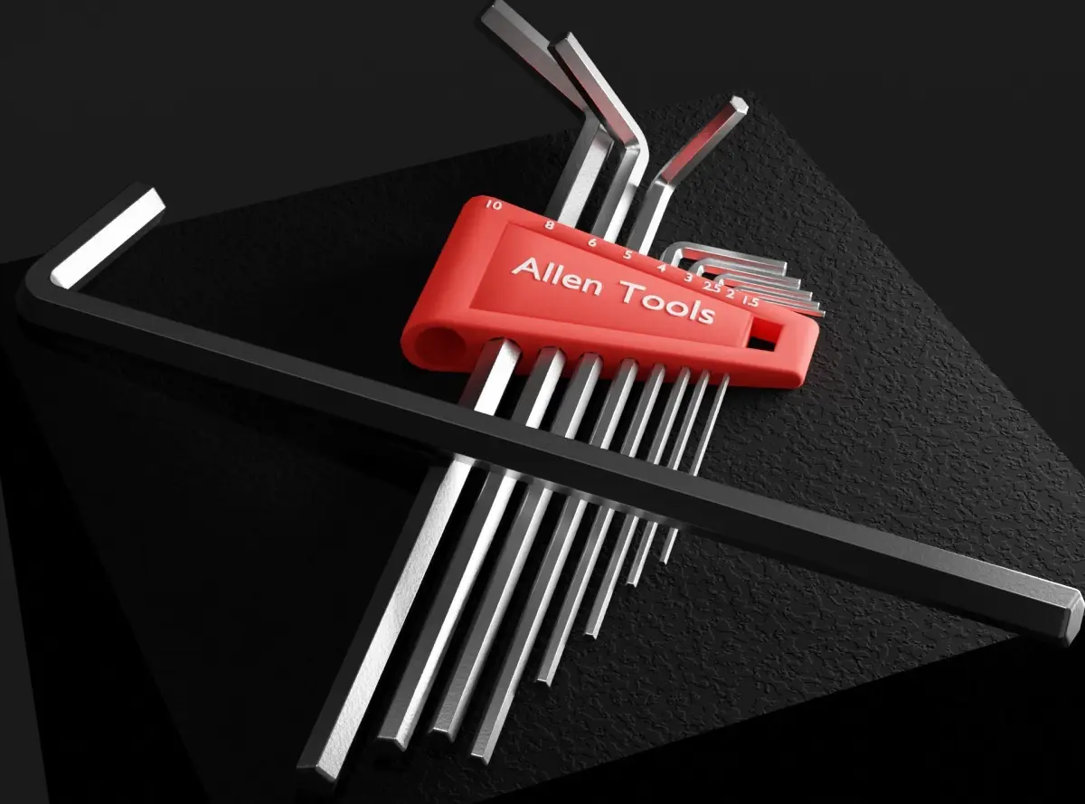 Description: L-shaped allen key, hexagonal in shape. Flat points on both ends of the tool. Flat sides have a vanadium steel finish with a rough texture. Edges of the tool are depicted worn and polished. Set ranging from 10mm to 1.5mm.
