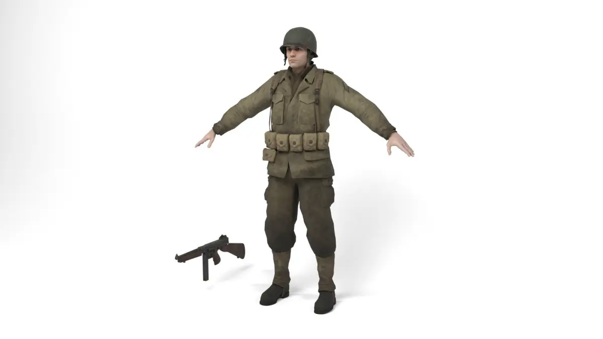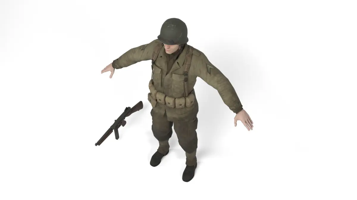 3D model of a american allied soldier of the second world war. Weapon included. The model includes bones and several animations. Model ideal to be used in games, advertising and video production. Low-poly models to be used easily in any project.