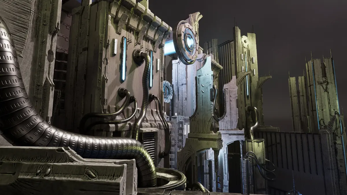 The pack contains a set of different elements for building alien structures, several seamless materials for pipes and walls, a set of pre-assembled buildings, as well as a pre-assembled demo scene.