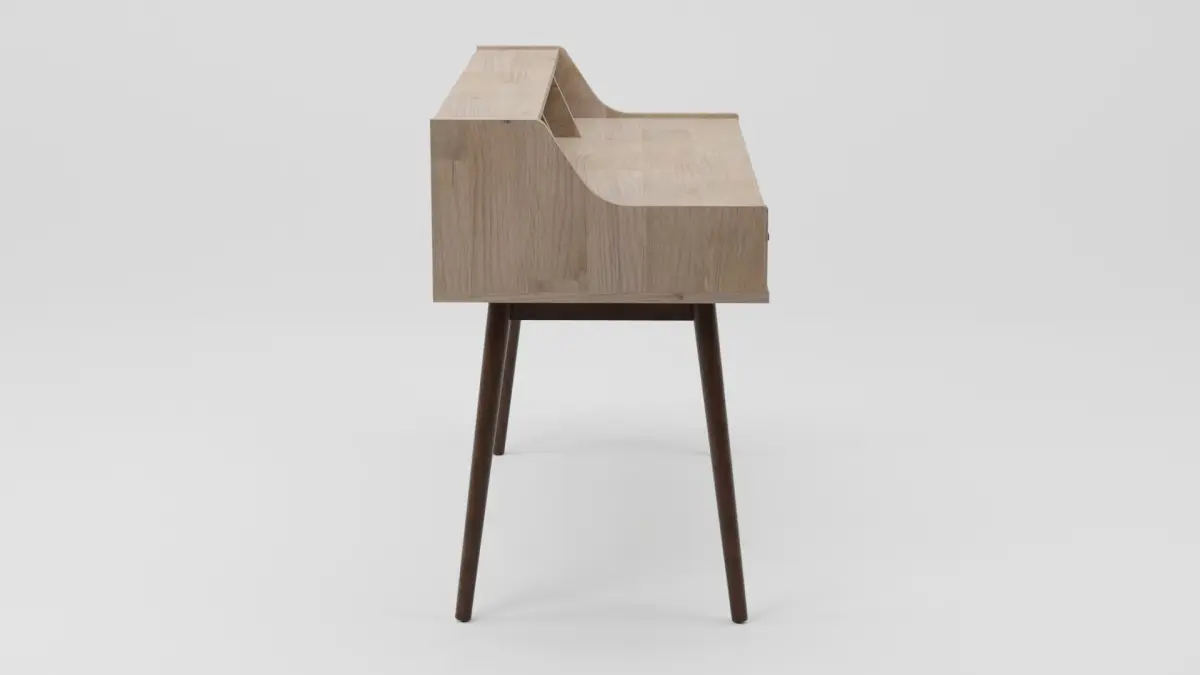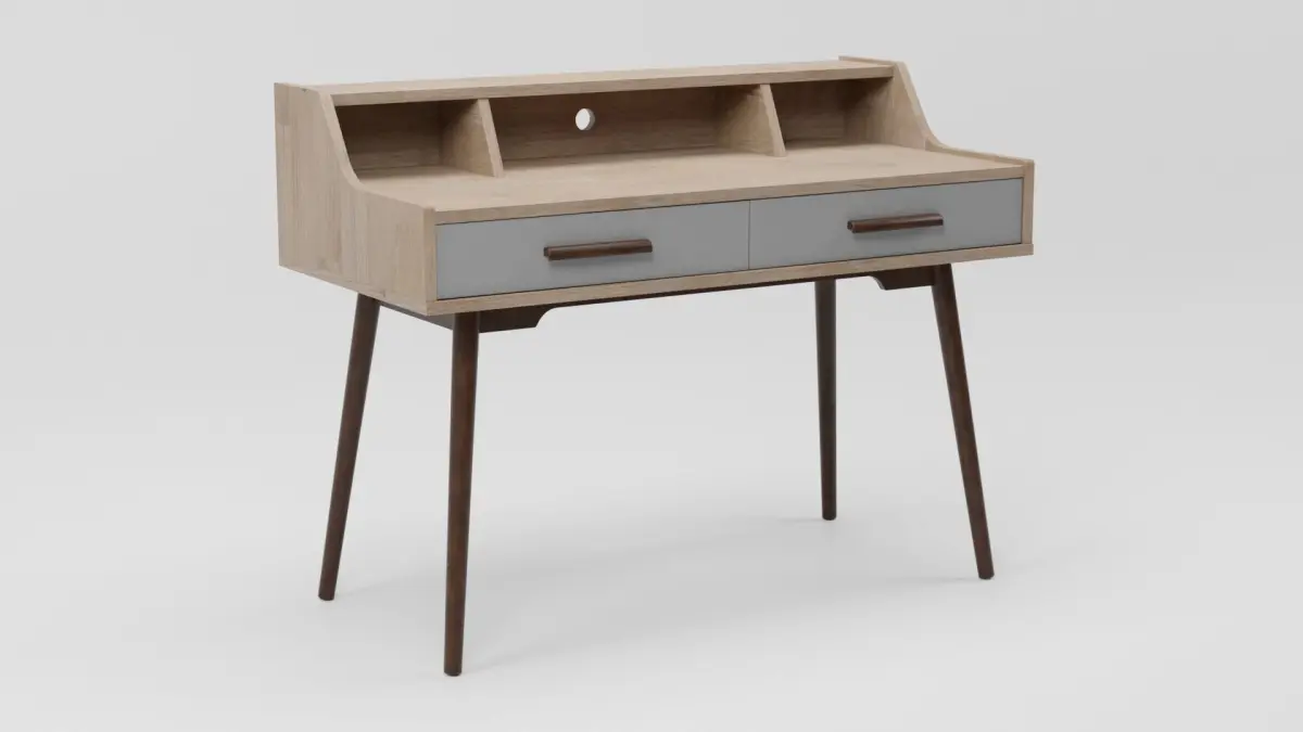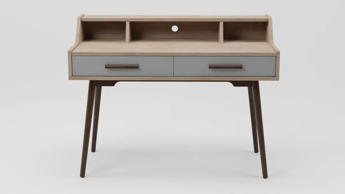 With a neat, Scandinavian design this home office desk has two drawers and 3 open compartments to store all your documents and office equipment. In light wood and grey with tapered wood legs, it brings a retro feel to your home office.