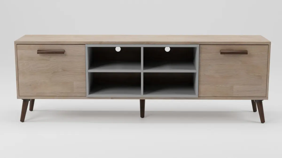 This TV unit is both stylish and functional with open shelving to display your media or decor, while two closing cabinets provide ample additional storage. Two convenient cut-outs make it easy to keep cables neat and organised. A light wood finish with grey accent make this a perfect piece to any living room.