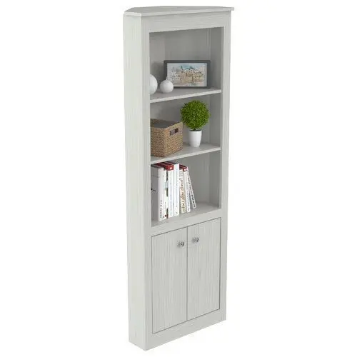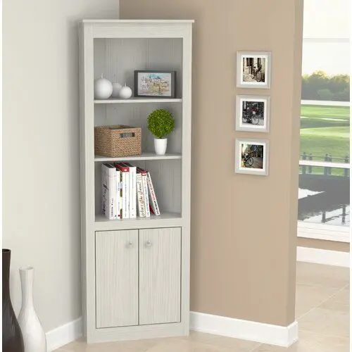 - The Alma Corner Unit Bookcase is constructed from manufactured wood and finished in double laminated durable melamine which is stain, heat, and scratch-resistant. Enhance your living room or home office with some conventional storage with this corner bookshelf that includes three permanent shelves perfect for books, picture frames, and much more.