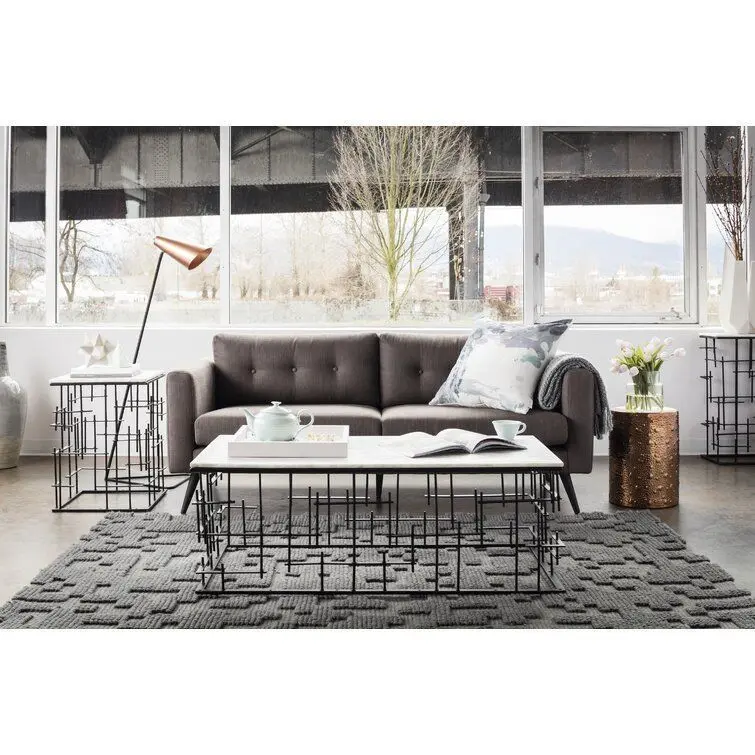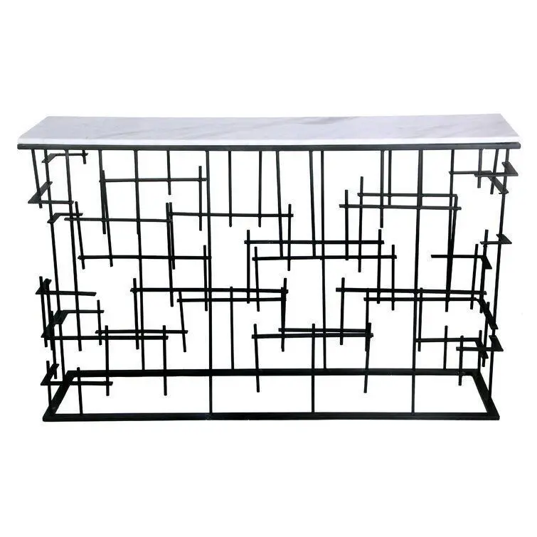 - A work of art in itself, this console table is sure to draw the eye in any room of the house. Floating iron bars, finished in black, piece together its airy openwork base, bringing mod style and the illusion of more floor space to your home. A marble slab completes the look up top with an organic touch; use it to display your favorite accents, or arrange spirits and barware on it for a chic home bar area.