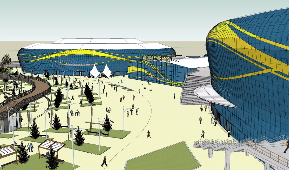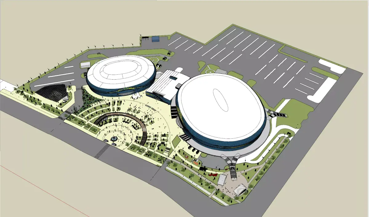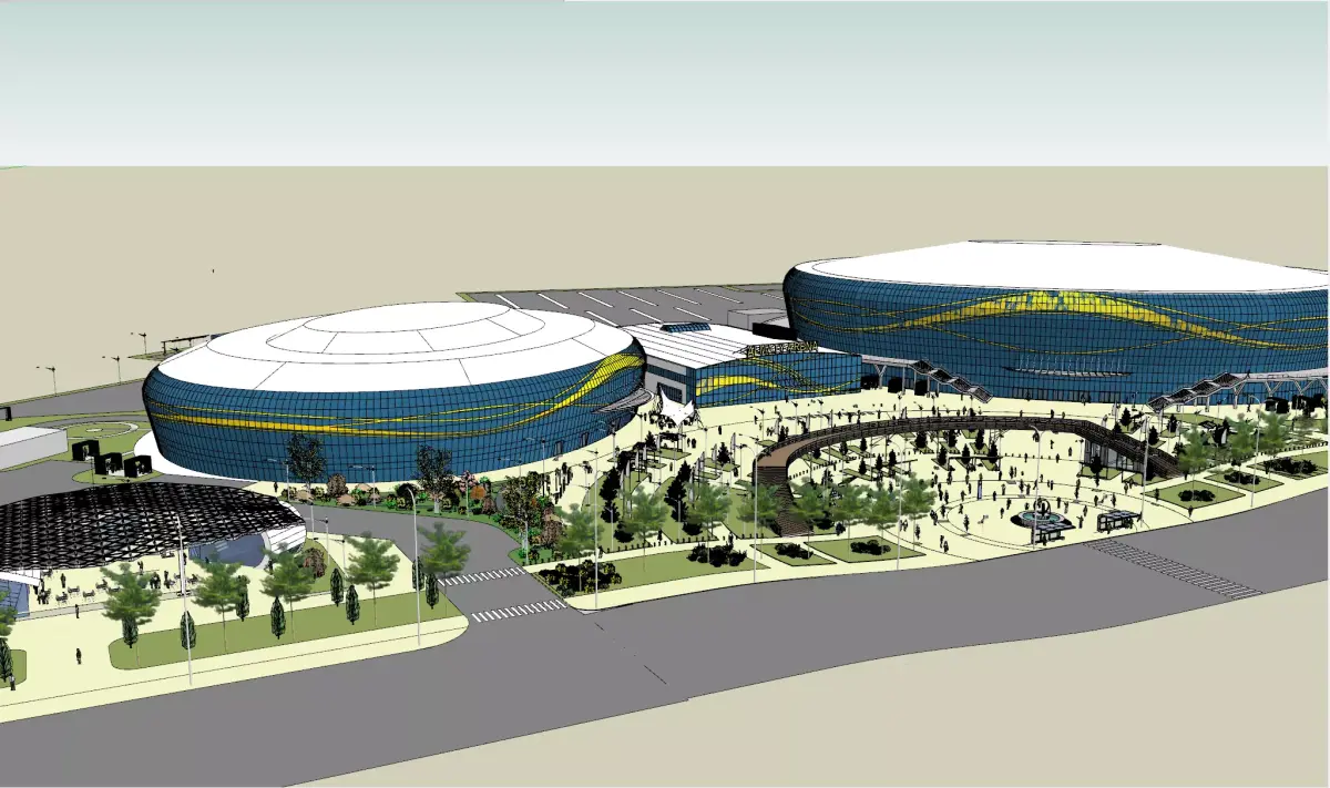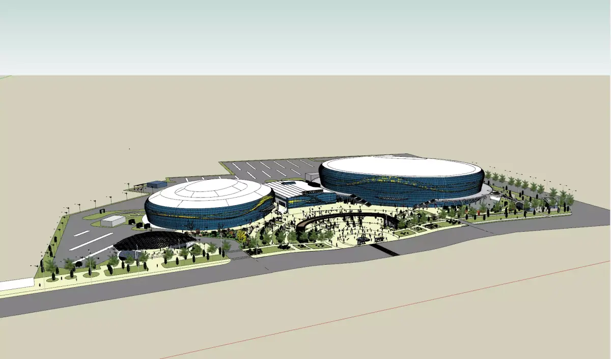 Two arena buildings with characteristic circular dome roofs and modern glass facadesCentral connecting pavilion/entrance structureSpacious public plaza with landscapingPedestrian bridge/walkway systemParking areaSurrounding infrastructure (roads, pathways)Landscape elements (trees, green spaces, urban furniture)Decorative elements and lighting fixtures