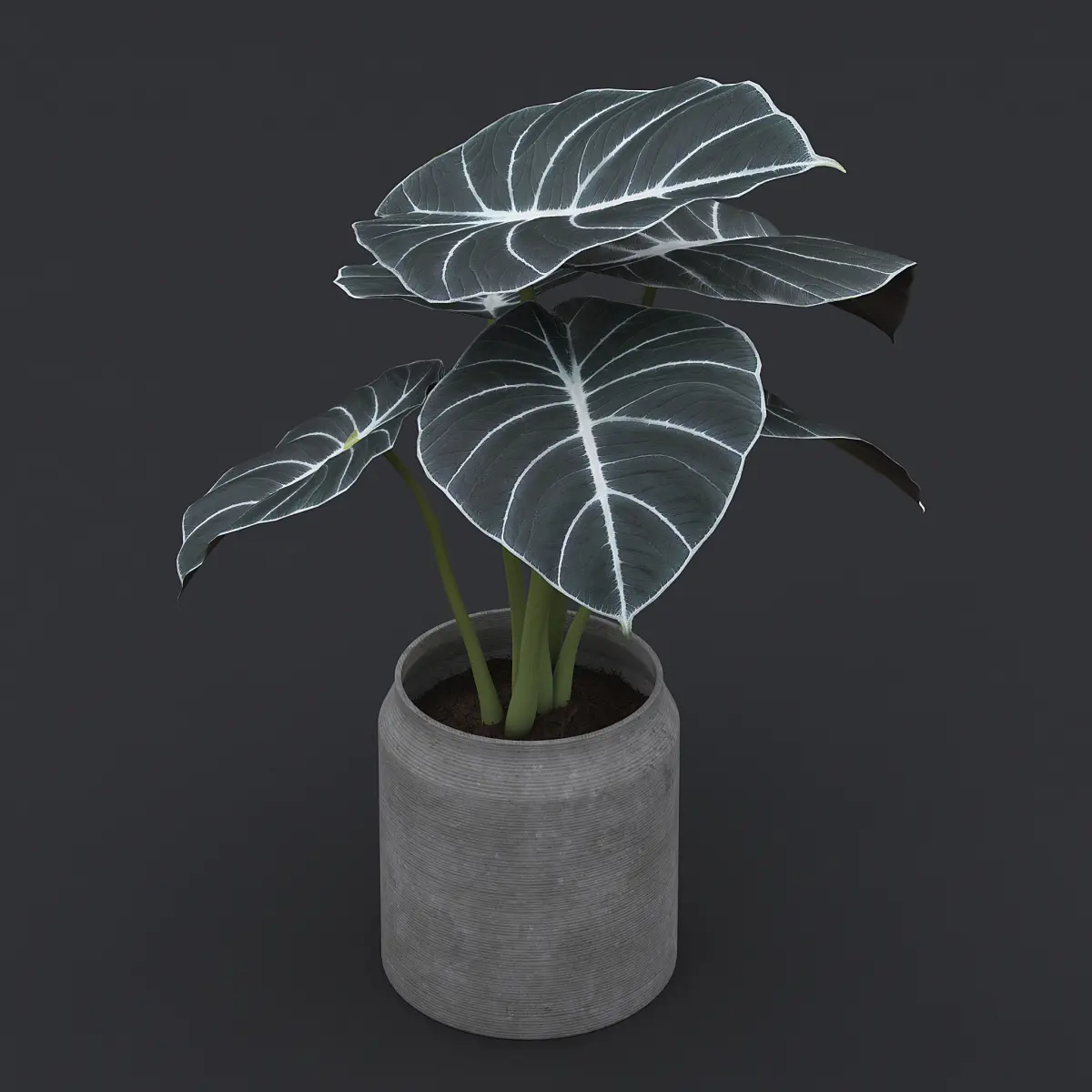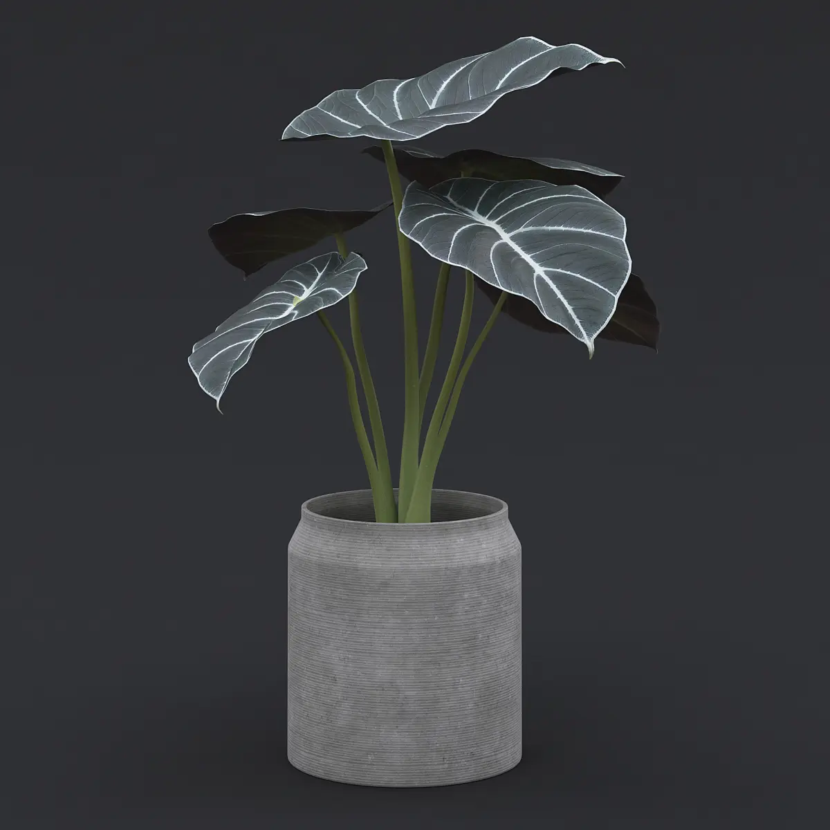 Alocasia black velvet plant in a grey concrete pot.