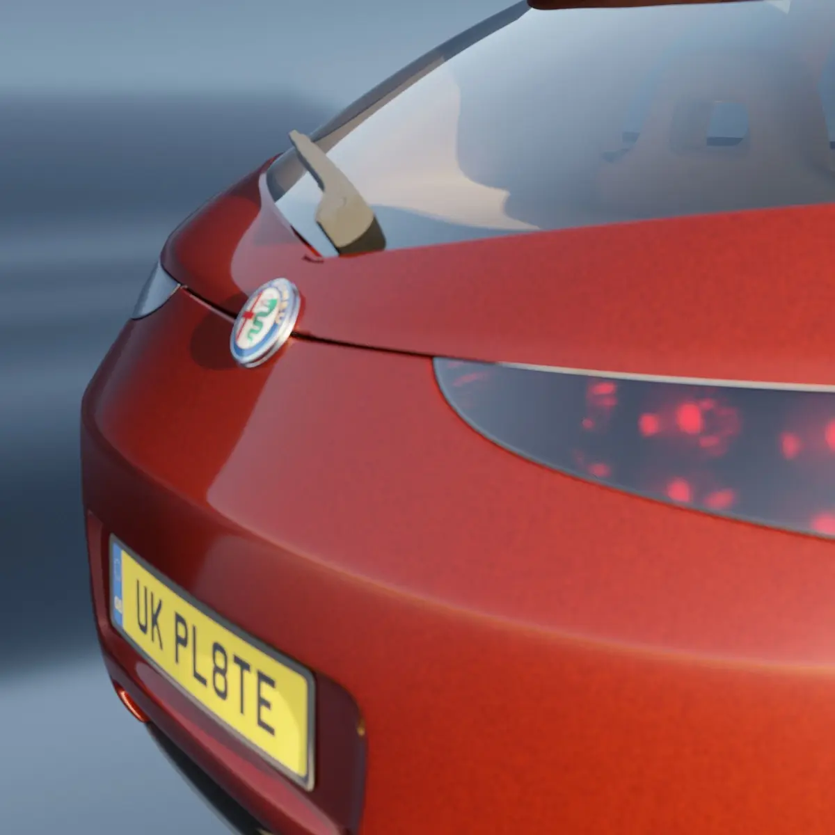 High-poly Alpha Romeo modelModeling and shading done in blender.2 textures used - logo + number plates - packed into blend file.Ready to use, just append it into your blender project and start creating ! Shaders works well both in Eevee and Cycles .FBX + Obj models with MTL files are there as well