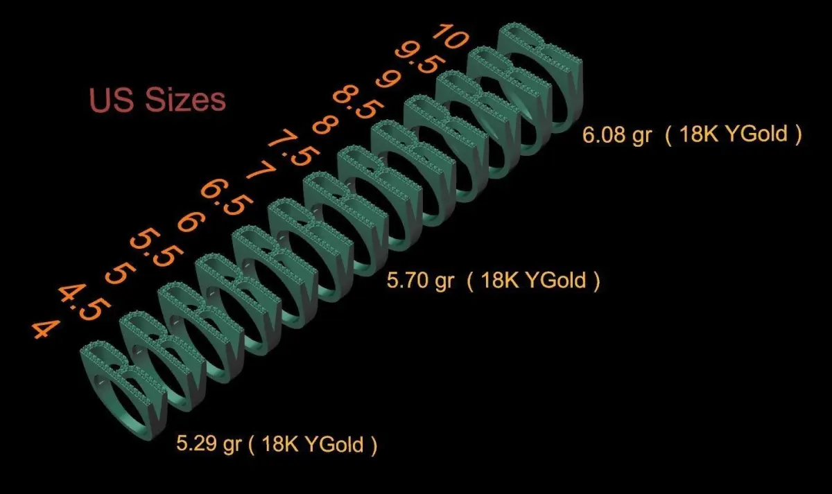 - Ring sizes (US): 4, 4.5, 5, 5.5, 6, 6.5, 7, 7.5, 8, 8.5, 9, 9.5, 10