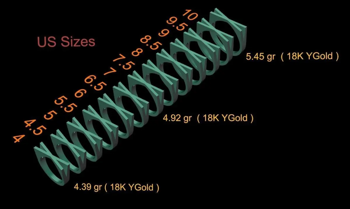 - Ring sizes (US): 4, 4.5, 5, 5.5, 6, 6.5, 7, 7.5, 8, 8.5, 9, 9.5, 10