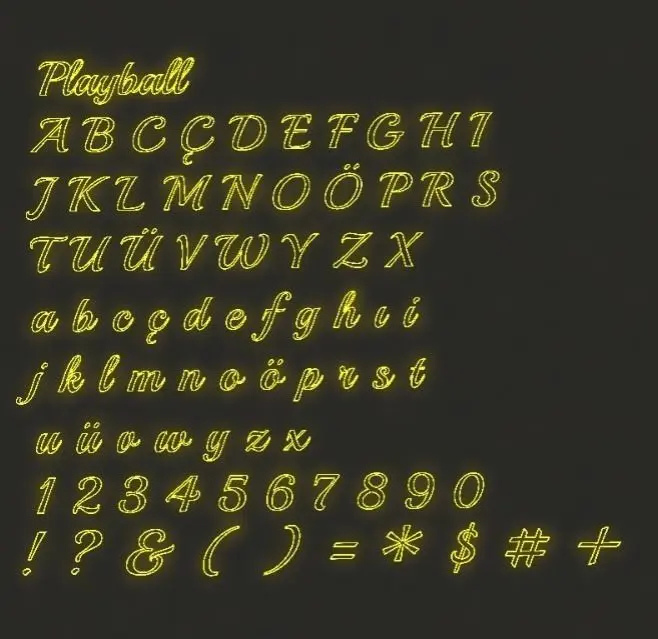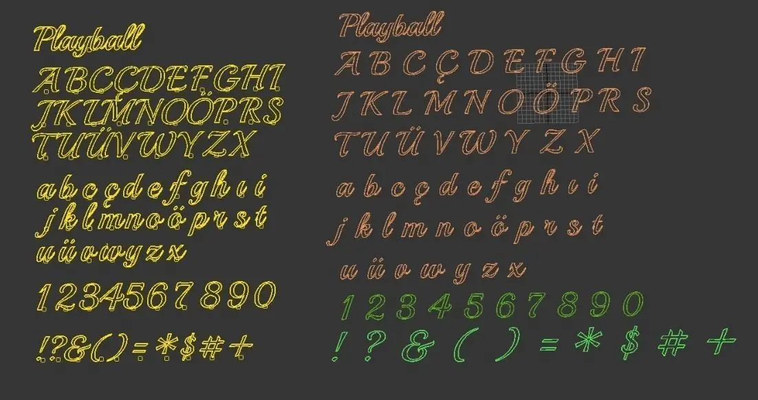 Alphabets and symbols written in the Playball font. Each letter was independently modeled and illuminated in a way that sentences can be formed using them. The lighting settings and colors can be adjusted. You can reach us for different formats or other fonts. Each symbol is a light object, but there is also an editable object version available. It is designed so that you can change the colors as you wish3ds.dae.obj.stl.