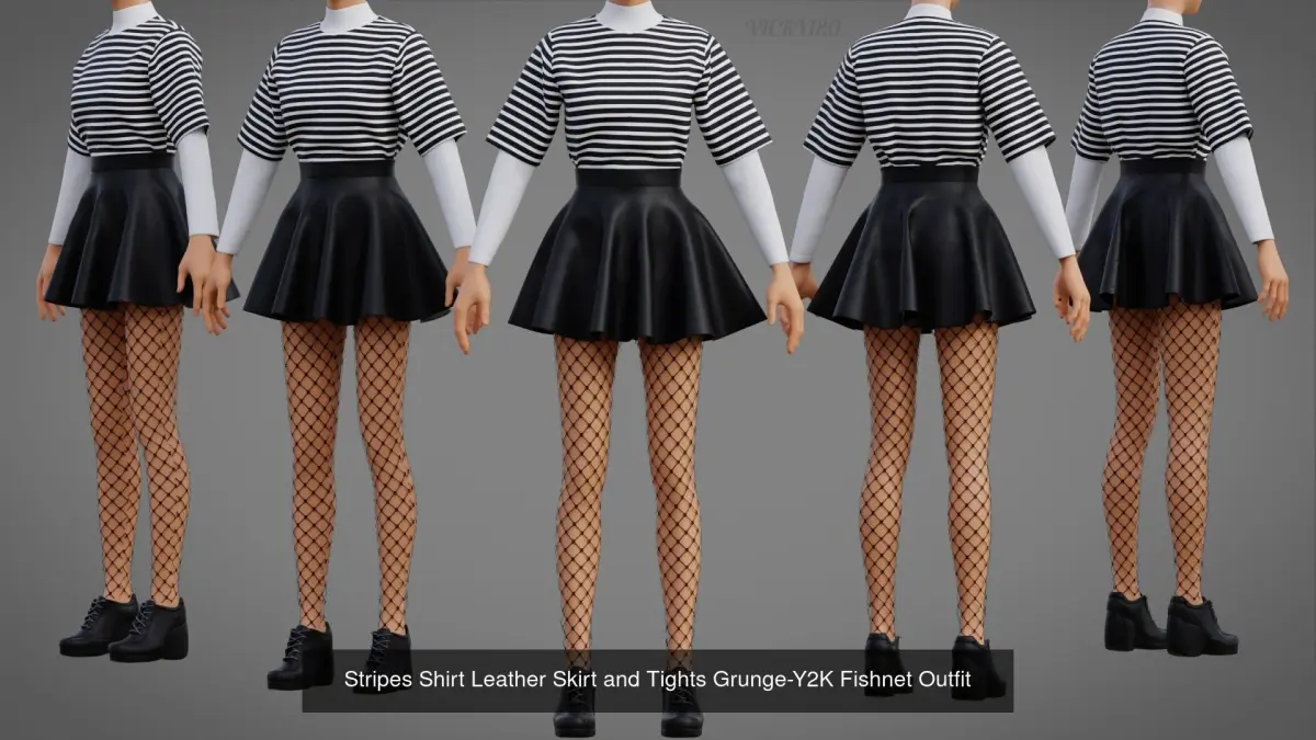 Stripes Shirt Leather Skirt and Tights Grunge-Y2K Fishnet Outfit