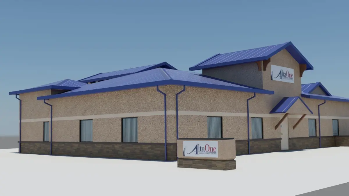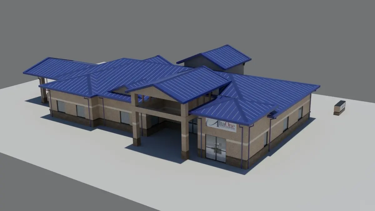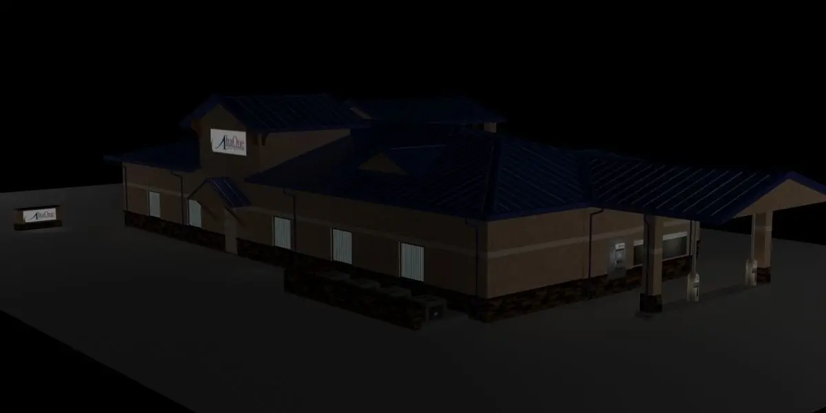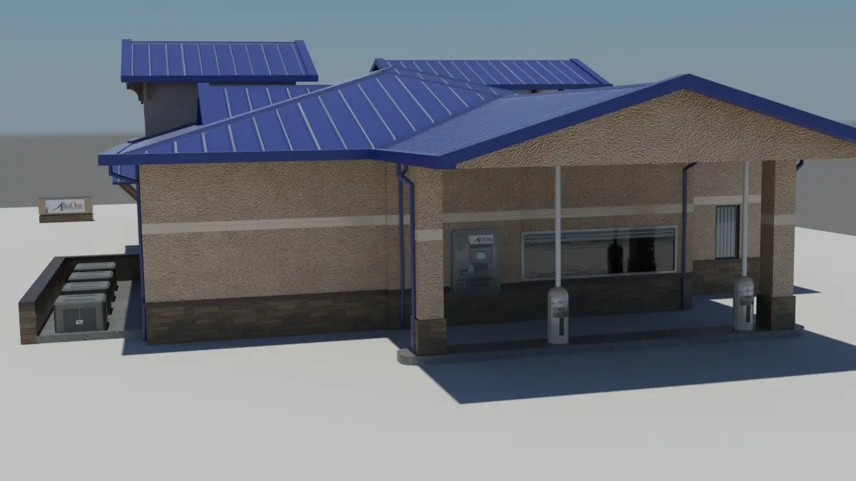 USA chain store - AltaOne Credit Union. Fully textured, low-poly building ready to drop into your scene or game. 2048x2048 diffuse, specular, bump/normal and self-illuminating light map included for dusk/night scenes. Maps can easily be altered to create different bank or business as desired. Office windows with vertical blinds, gutters, complex roof, stone work, heat/AC units and drive-thru gives a realistic look even close up.