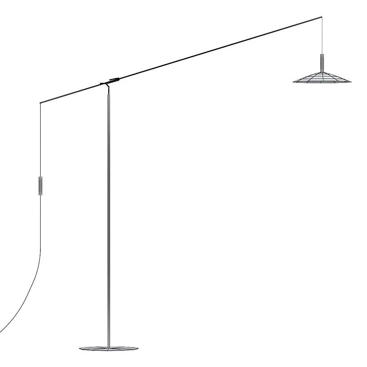 Altura floor lamp with structure and shade in matt varnished black metal.Altura is a projecting floor lamp. Two thin rods, one vertical and a horizontal one made of steel, are connected by a joint. Lightweight materials and sophisticated technology contained within the cone-shaped lampshade.