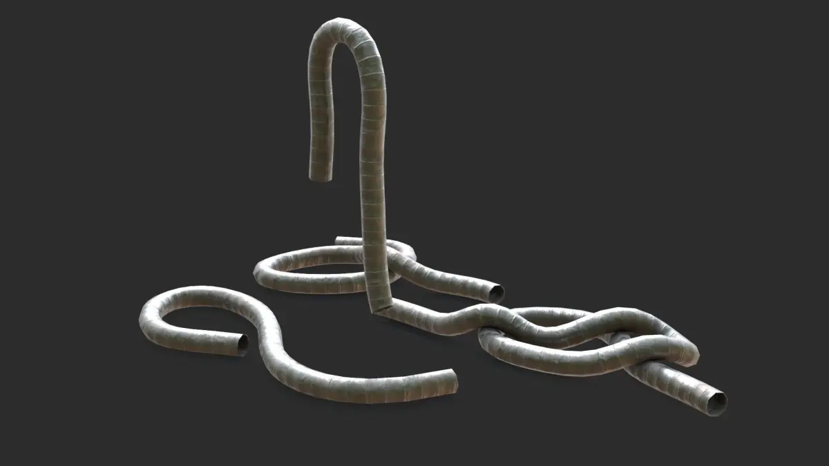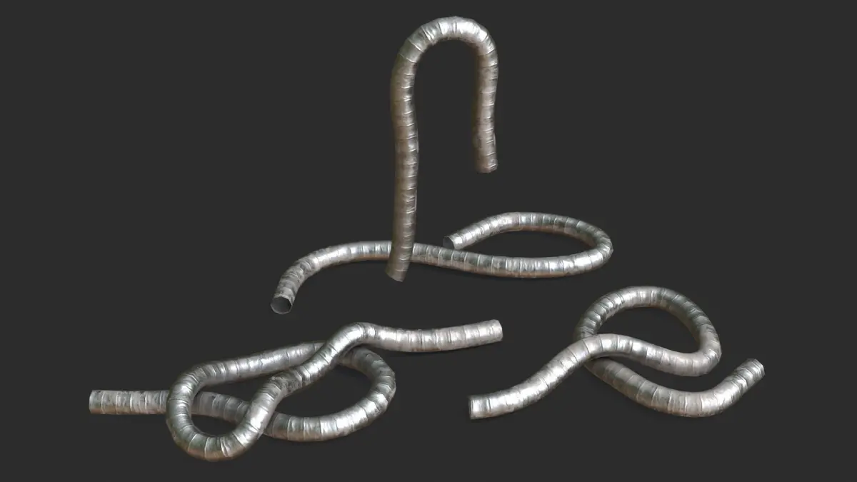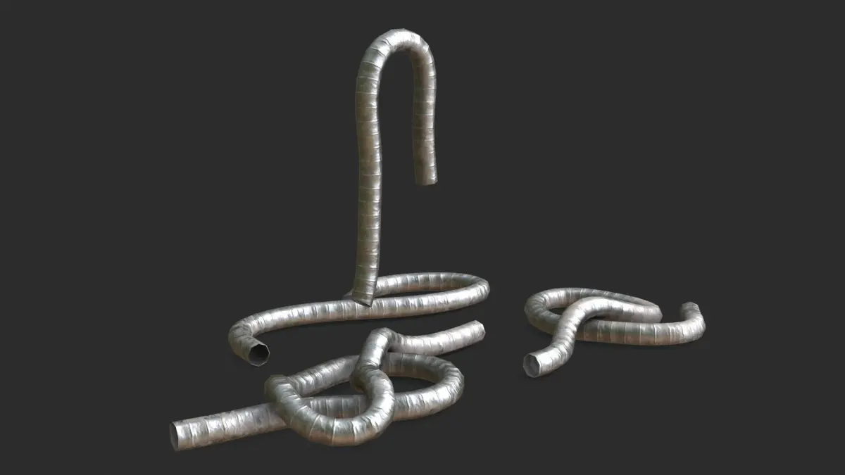 This metallic rope flexible duct includes 4 LODs. This set includes 4 individual pipe assets. The 4 pipes objects are ready for game and available in lowpoly and PBR ready.