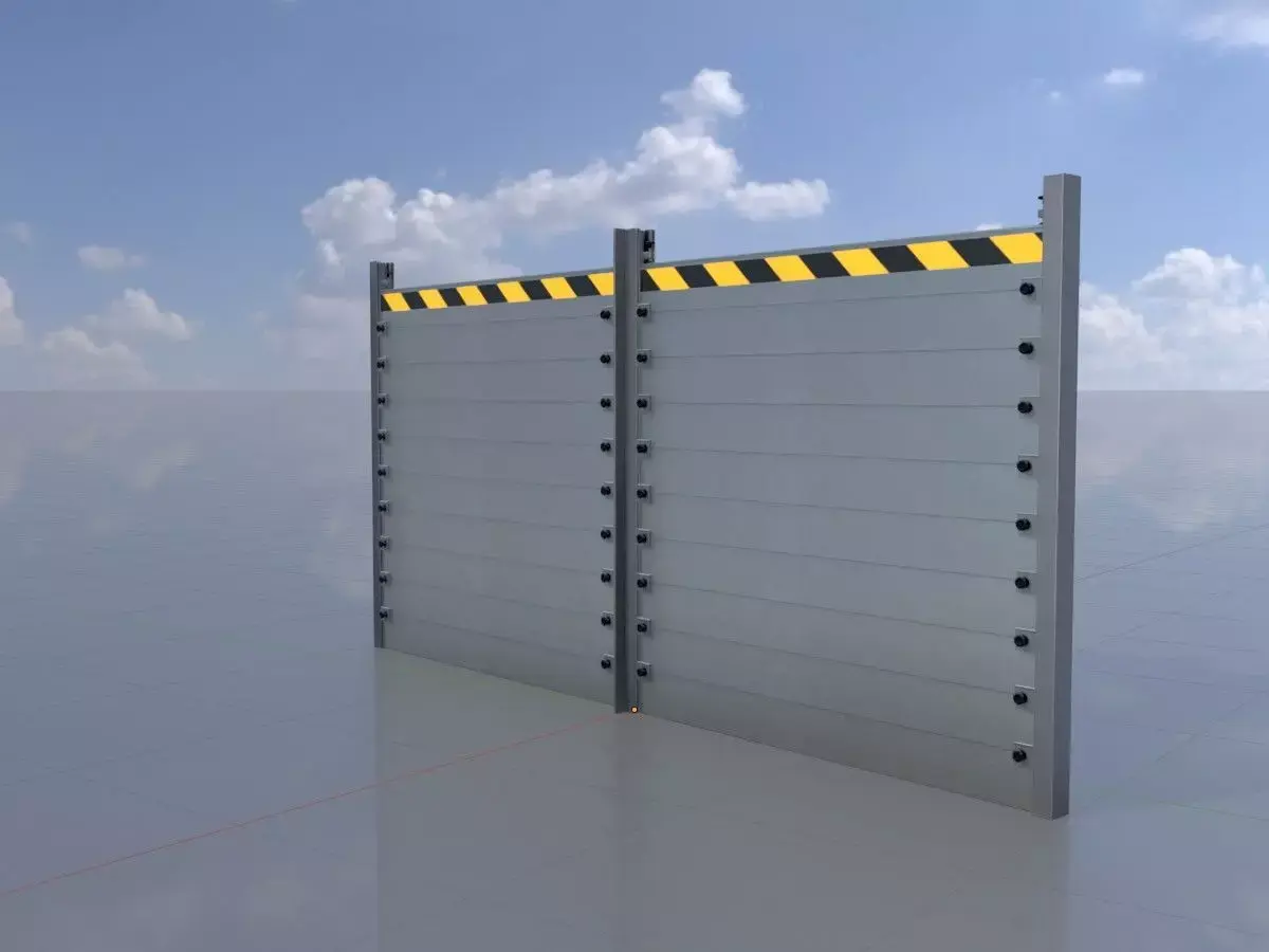 - Hier sehen Sie ein 3D-Modell einer aus Aluminium bestehenden Hochwasserschutzwand.