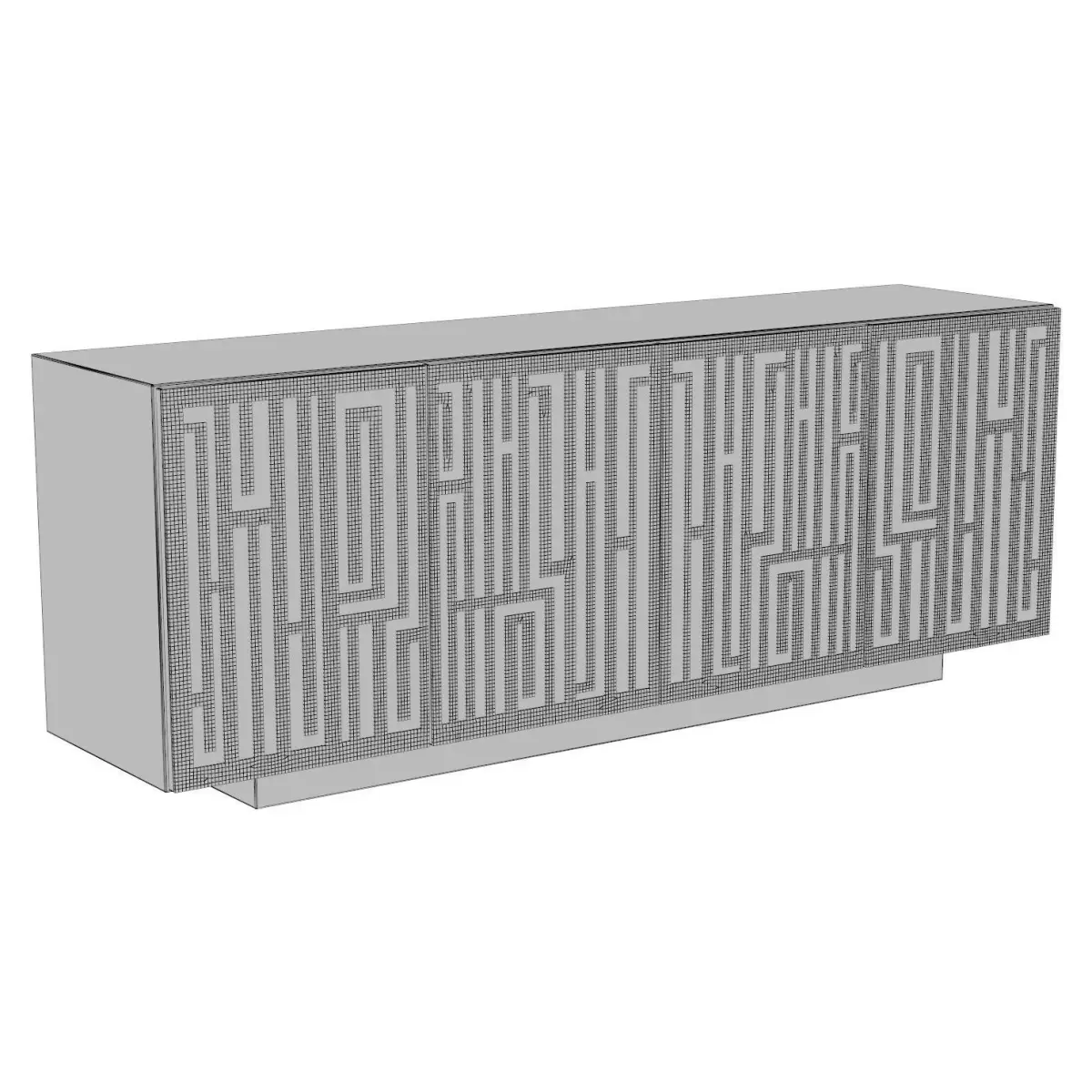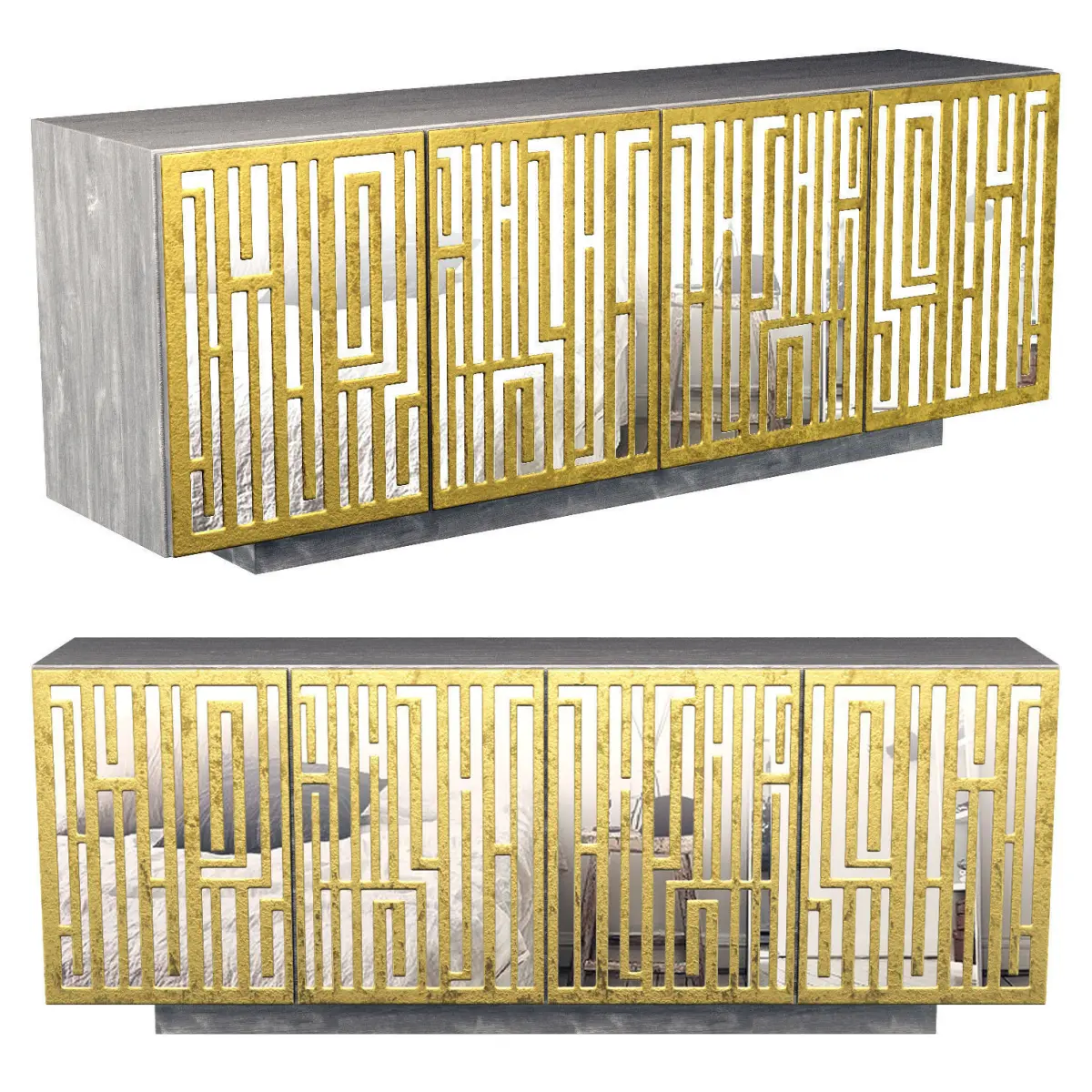 Sandblasted Oak veneers in Weathered Charcoal finish Four push-to-open doors with Cast Aluminum grille work in Graphite finish over mirrored glass door fronts and soft/self closing hinges Behind end doors is one adjustable/removable shelf and one covered grommet hole in back panel for wire management Behind center doors is oneadjustable/removable shelf, one drawer, and one covered grommet hole in back panel for wire management Plinth base Adjustable glides Note: For safety, an anti-tipping kit is included with instruction sheet