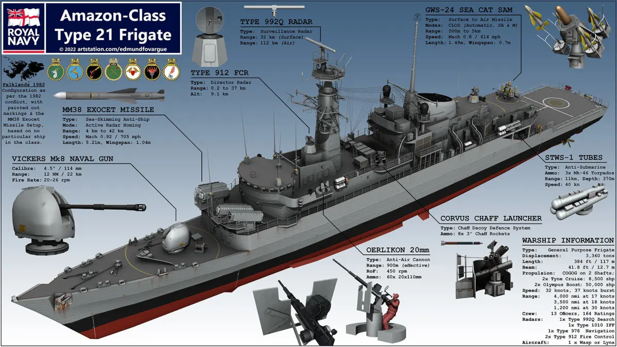Except for HMS Amazon, all the class took part in the 1982 Falklands War as the 4th Frigate Squadron. They were heavily involved, performing extensive shore-bombardment missions and providing anti-submarine and anti-aircraft duties for the task force. On 10 May, HMS Alacrity and Arrow probed through Falkland Sound at night, searching for minefields that might have impeded landings and operations, almost as expendable hulls. Alacrity engaged and sank an Argentine naval supply vessel in the Sound. On exiting the Sound at daybreak, they were attacked by the Argentine submarine San Luis, which fired a torpedo at them but only struck Alacrity's Type 182 Torpedo Decoy (as intended). Two ships were lost during the conflict: Ardent was hit by bombs dropped by Argentine aircraft on 21 May and consumed by fire; Antelope was hit by bombs on 23 May but initially failed to detonate; later, one was accidentally set off by the bomb disposal team attempting to defuse it on 24 May, causing the ship to catch fire and setting off her magazines, resulting in her breaking her back and sinking.More info here: https://www.realitymod.com/forum/blog.php?b=439