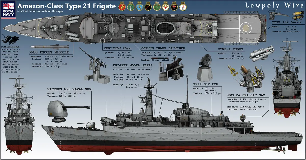 Lowpoly Model of the Amazon-Class Type 21 Frigate, as per its Typical '82 Configuration.