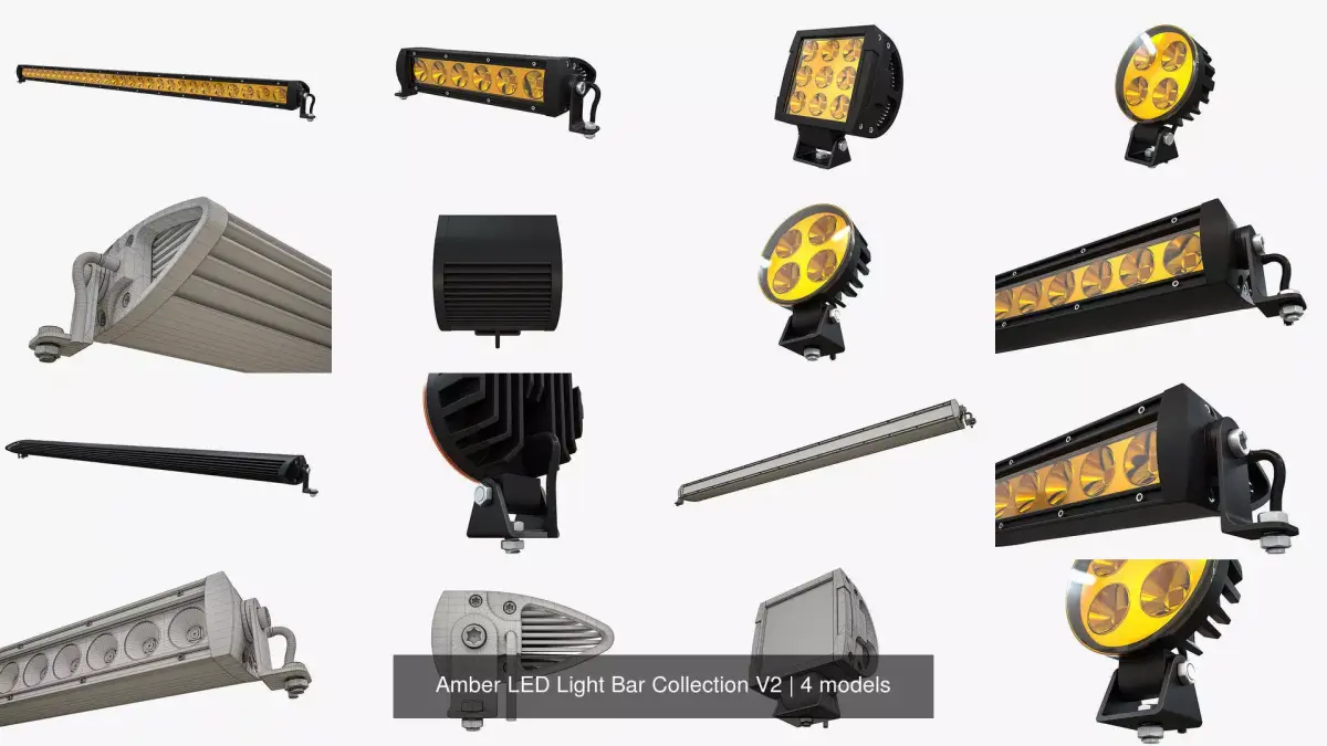A collection of detailed 3D models of 4 Amber LED light bars , modeled in Cinema 4D and rendered with V-Ray 5. The models were created using approximate real world dimensions.