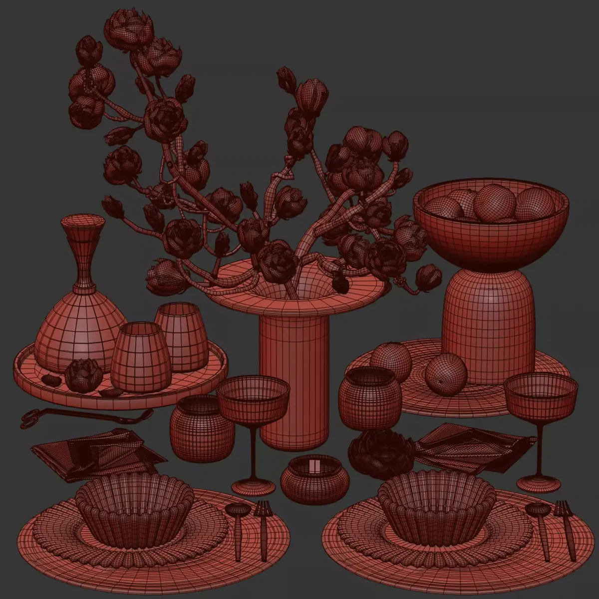 Key Features: • Realistic Details: Detailed blossom branches, smoky glass vase, layered ceramic tableware, metal cutlery, and amber candleholders. • Versatile Use: Suitable for dining rooms, kitchen interiors, cafés, and editorial scenes. • Design Style: Complements Japandi, Scandinavian, modern, and warm minimalist interiors.