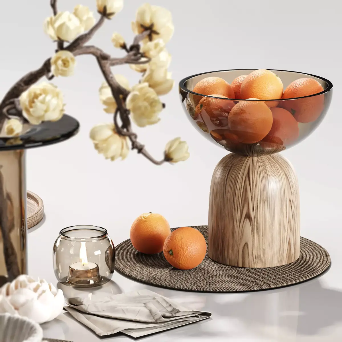Name: Amber Serenity Dining Composition 28Description:An artfully styled dining scene featuring soft cream blossom branches arranged in a smoky amber glass vase, surrounded by layered ceramic dinnerware, amber-tinted glassware, and natural woven placemats. The warm wooden tones, gentle candlelight reflections, and fresh oranges bring an inviting harmony and organic vibrancy to the composition.Perfectly blending minimal sophistication with natural warmth, this set captures the serene balance of Japandi and Scandinavian aesthetics. Ideal for photorealistic interior renders, lifestyle visualizations, or editorial dining scenes where calm elegance and tactile realism are key.