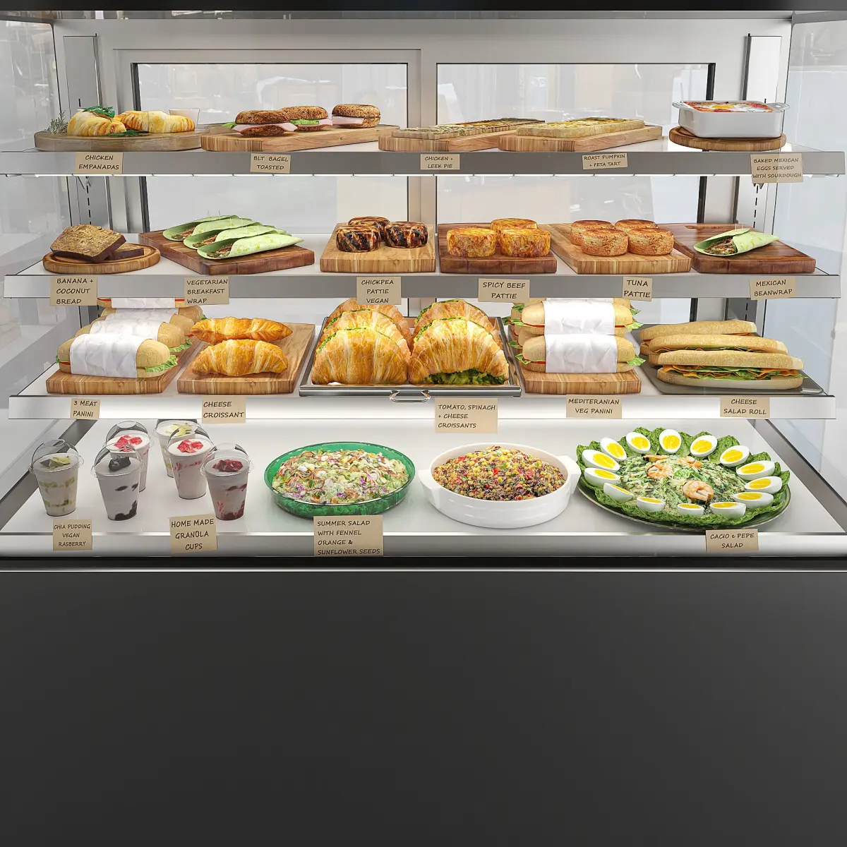 This model is a representation of a food showcase in a cafeteria called Little Olive Leaf Café located in Carawatha Park in Australia.