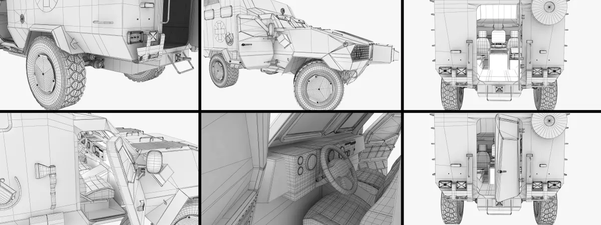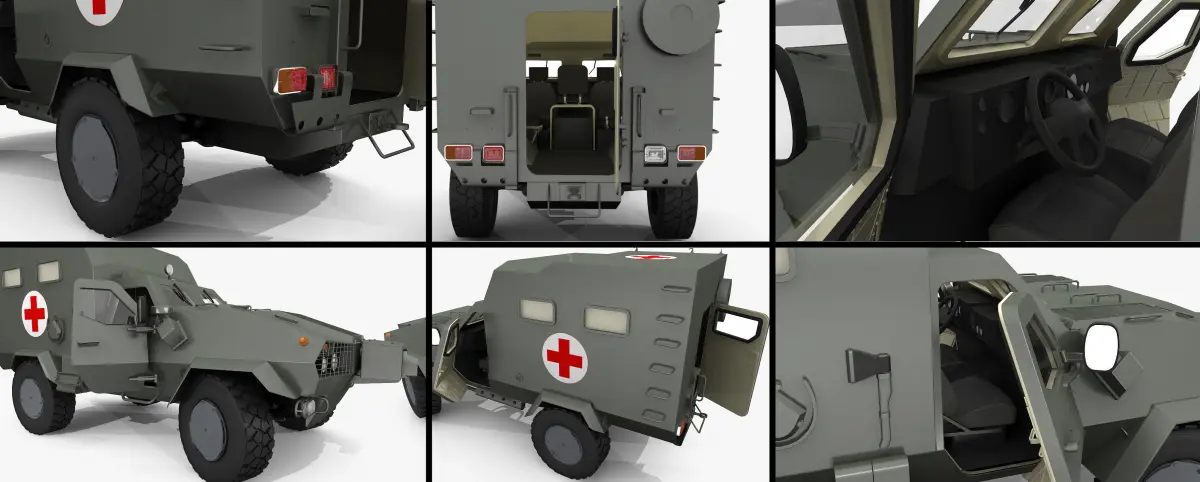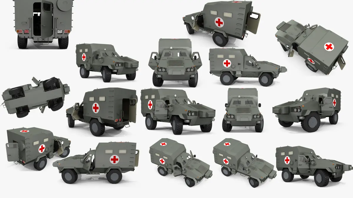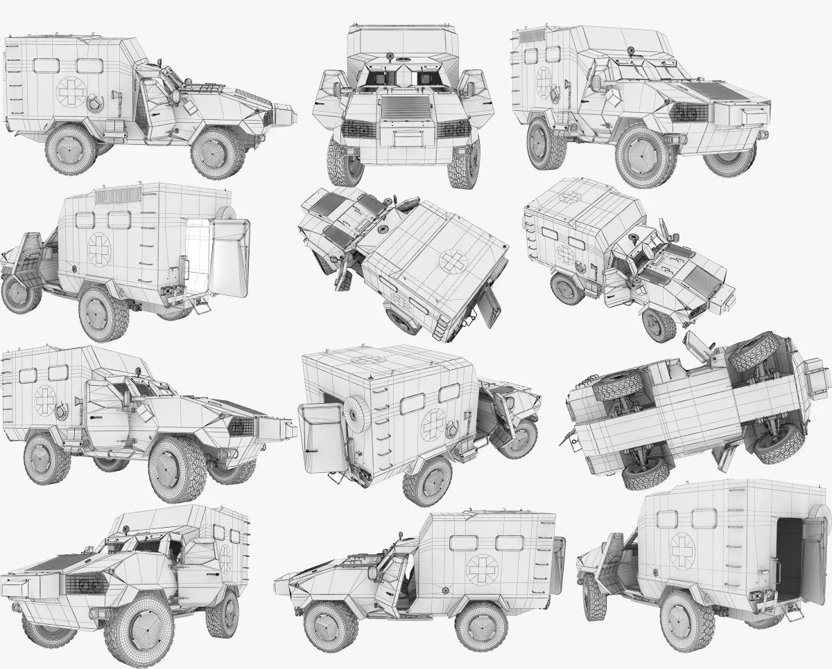 The 3d military vehicle colection is made in 3ds max 2015 and rendering in vray 3.60.03 render.The 3D Amulance vehicle collection is made in 3ds max 2015 and renderin in vray 3.60.03 render. All models is made in natural dimmentions and positioned at center coordinate. The collection include next models as Patria AMV, Rinkhals, BTR-50, Bear Cat, Kozak , Dozor-b. Some of this models have two colores in max scena which you can chandge on your whish.