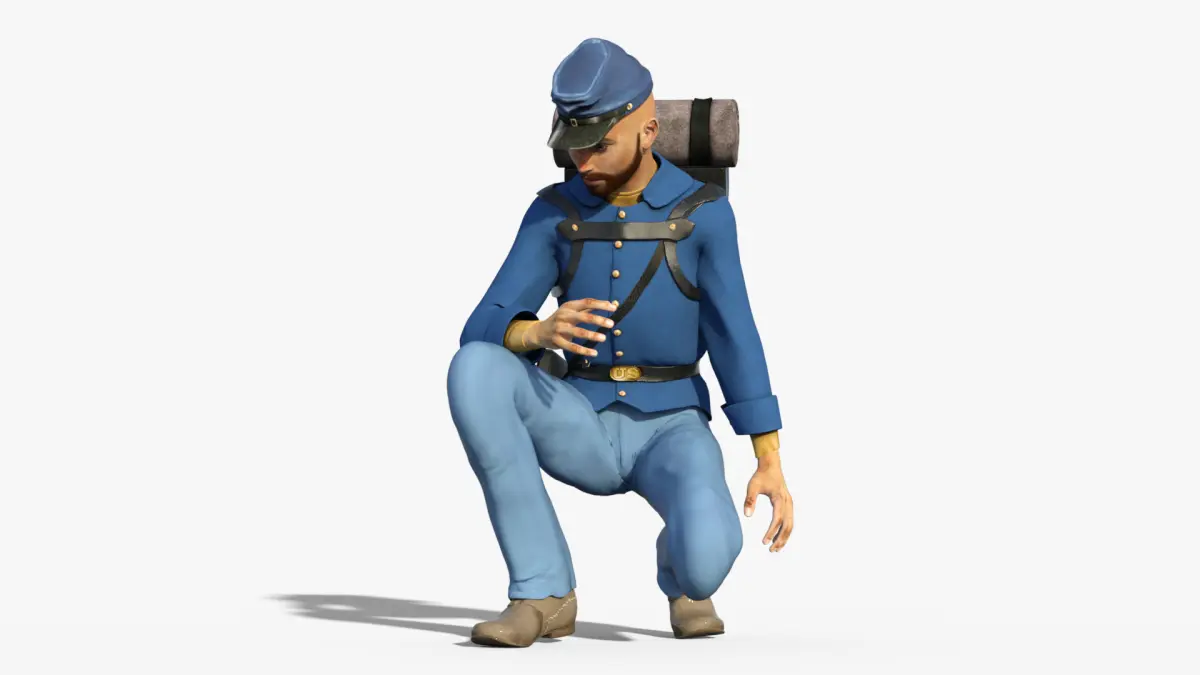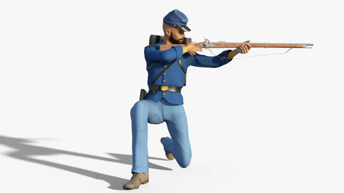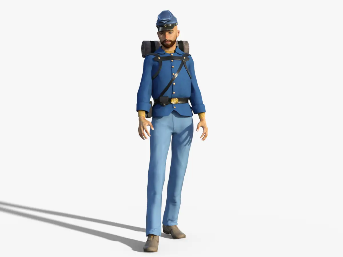 Cap 3116 vertices, 2966 polygons, 8 bones, 5932 triangles Cartridge belt 2032 vertices, 1897 polygons, 6 bonesBody675 vertices, 600 polygons, 13 bonesbackpack_straps 19296 vertices, 18872 polygons, 72 bonesboots 3906 vertices, 3346 polygons, 12 bonespants 9126 vertices, 7834 polygons, 12 bonesus jacket 13464 vertices, 13379 polygons, 13 bonesUS Cup 16997 vertices, 16509 polygons, 28 bonesbugle 3490 vertices, 2354 polygons cap pouch 8752 vertices, 8622 polygons cartridge_box 679 vertices, 621 polygons rifle 1030 vertices, 962 polygons us_backpack 5859 vertices, 5437 polygons 110976 vertices, 5154 polygons us flag 4419 vertices, 4352 polygons