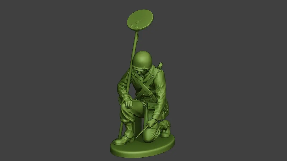 - American engineer soldier model with SCR-625, clothes and more. Model searching the mine with a knife.