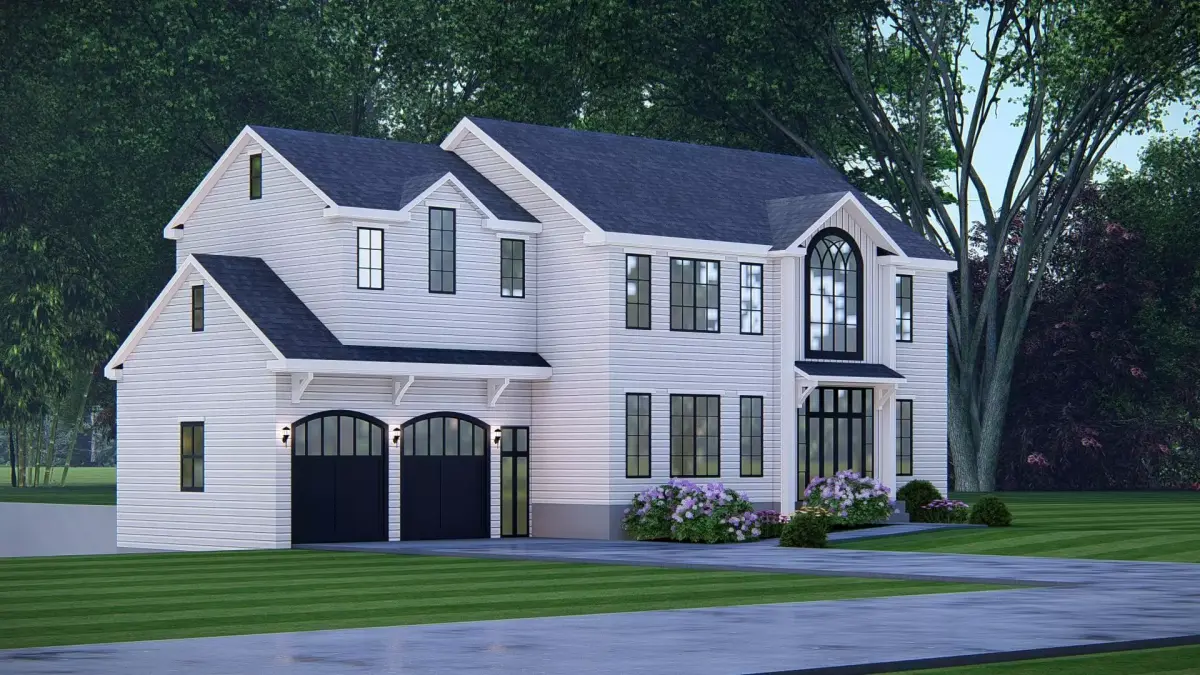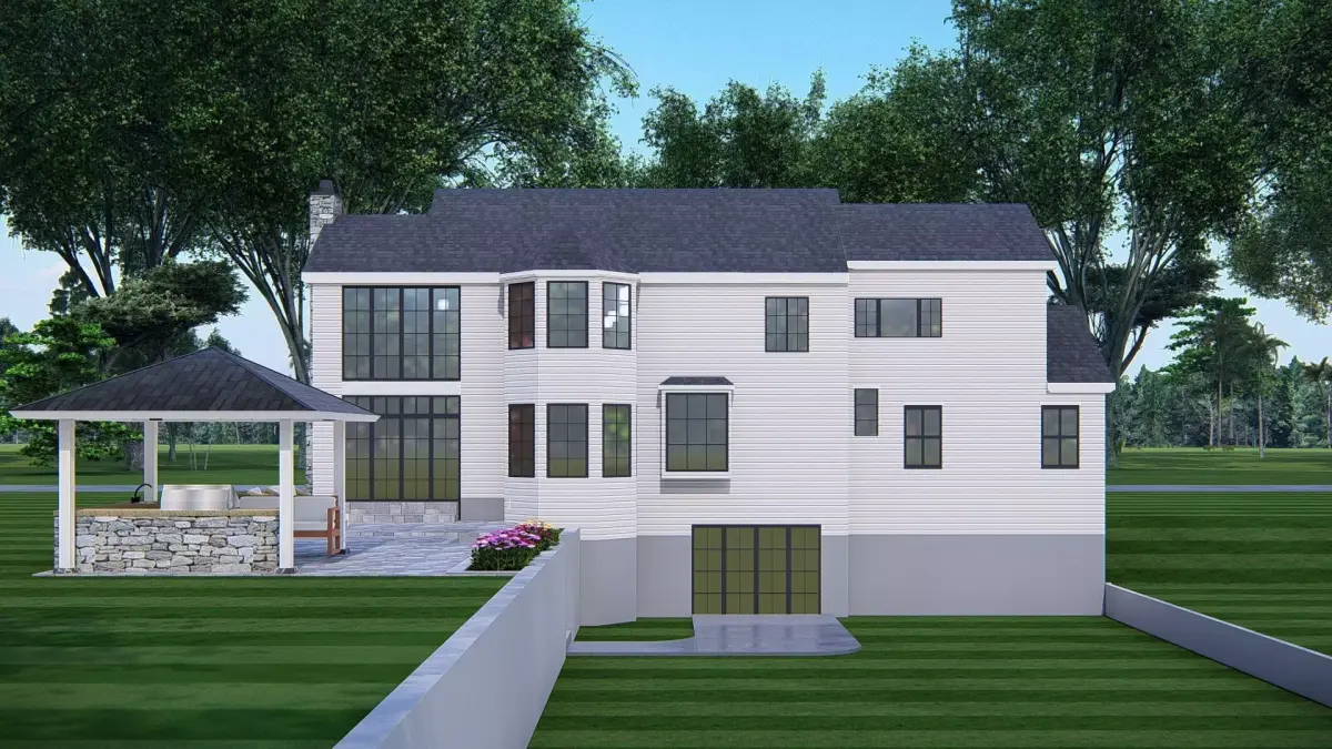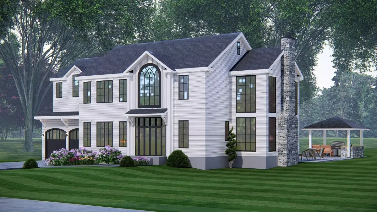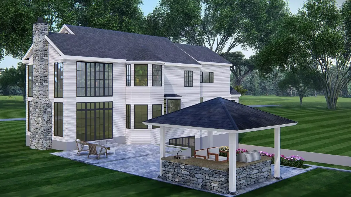 This 3D render of an American Exterior House Design showcases the timeless charm and functionality of classic American architecture. Featuring a pitched roof, wide porch, clean facade, and balanced proportions, the design captures the essence of family-friendly suburban living while blending modern comfort with traditional style.