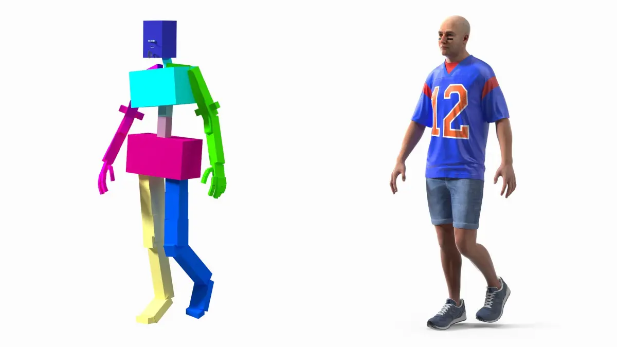 American Football Fan Wearing Blue Jersey Rigged is fully rigged and is ready to be animated. You can easily position it the way you need or animate it the way your project requires using helpers in 3D Studio Max. See the turntable to get an idea of how rigging works.
