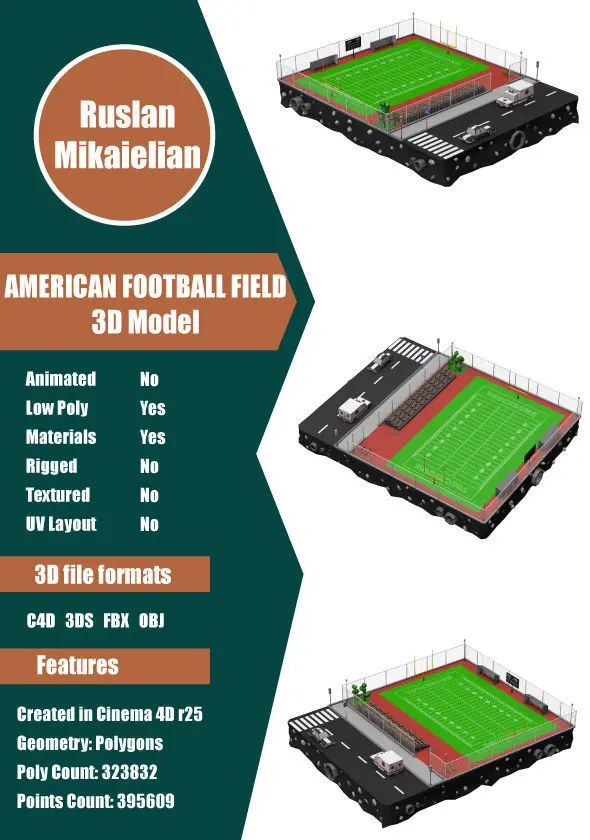 This is a great American Football Field Low Poly 3D model for you projects.