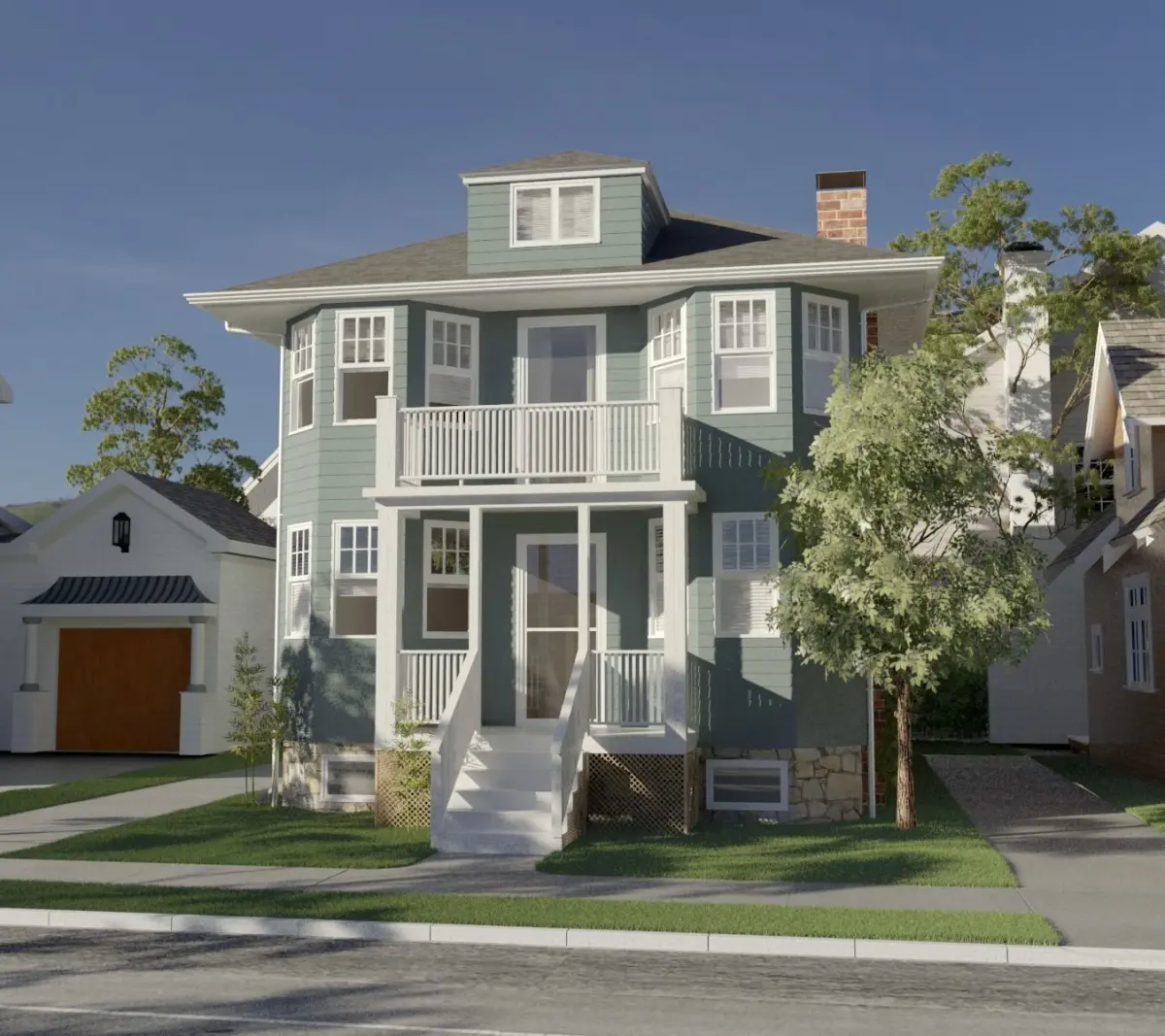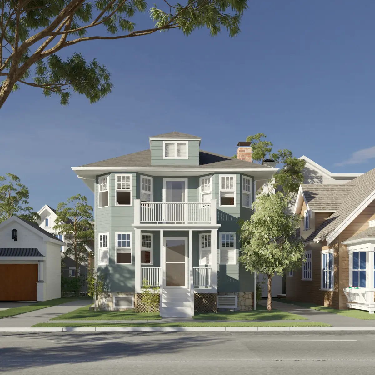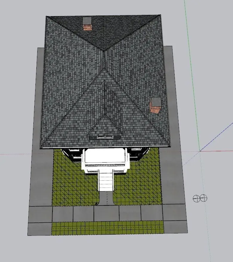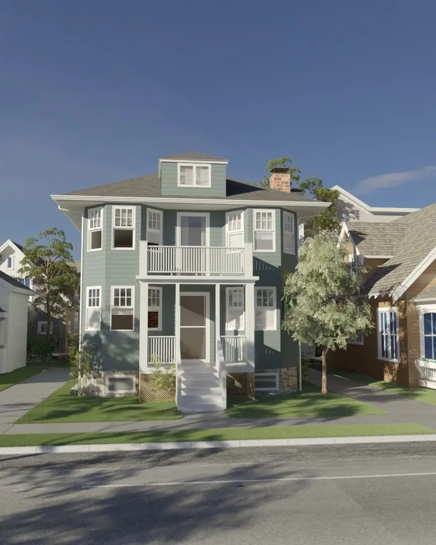 3d as shown in the image: screenshot. American house entirely in wood siding, white windows and doors, detailed roof (not just a texture) with chimneys and finishes, gutter and rain pipe, trusses/screens under the first porch, sidewalk and curbs modeled with details, the grass made in v-ray (fur plugin) not included, TREES, VEGETATION, NEIGHBORHOODS NOT INCLUDED (FILE SIZE NOT SUPPORTED).