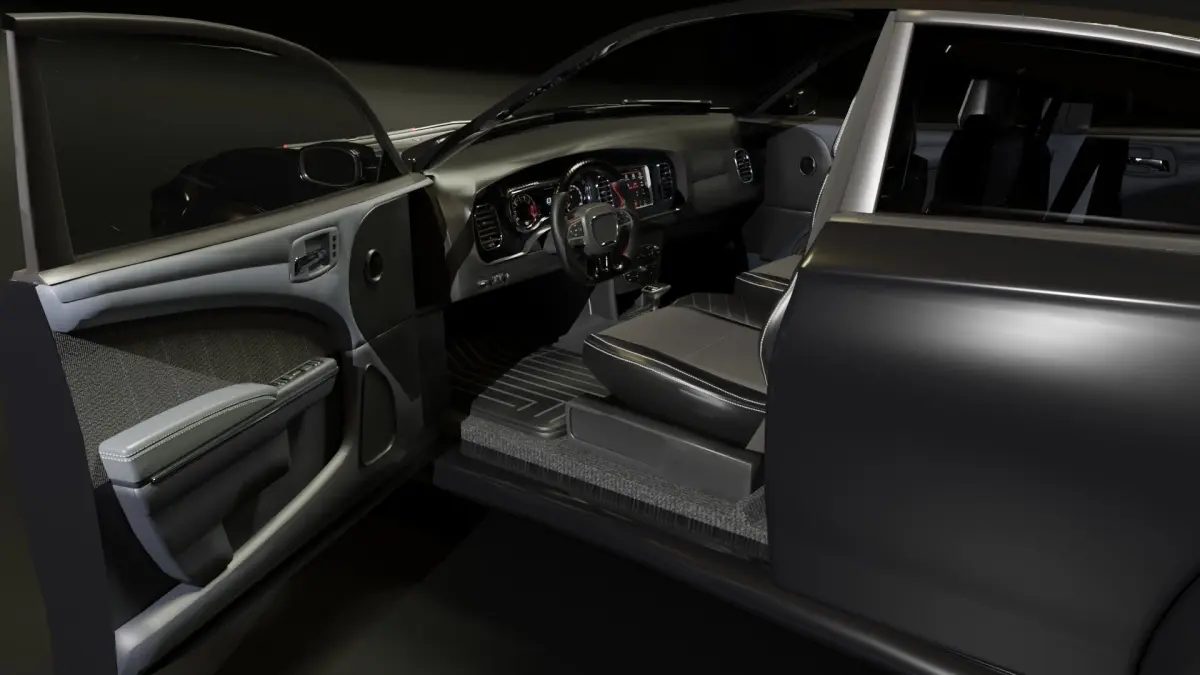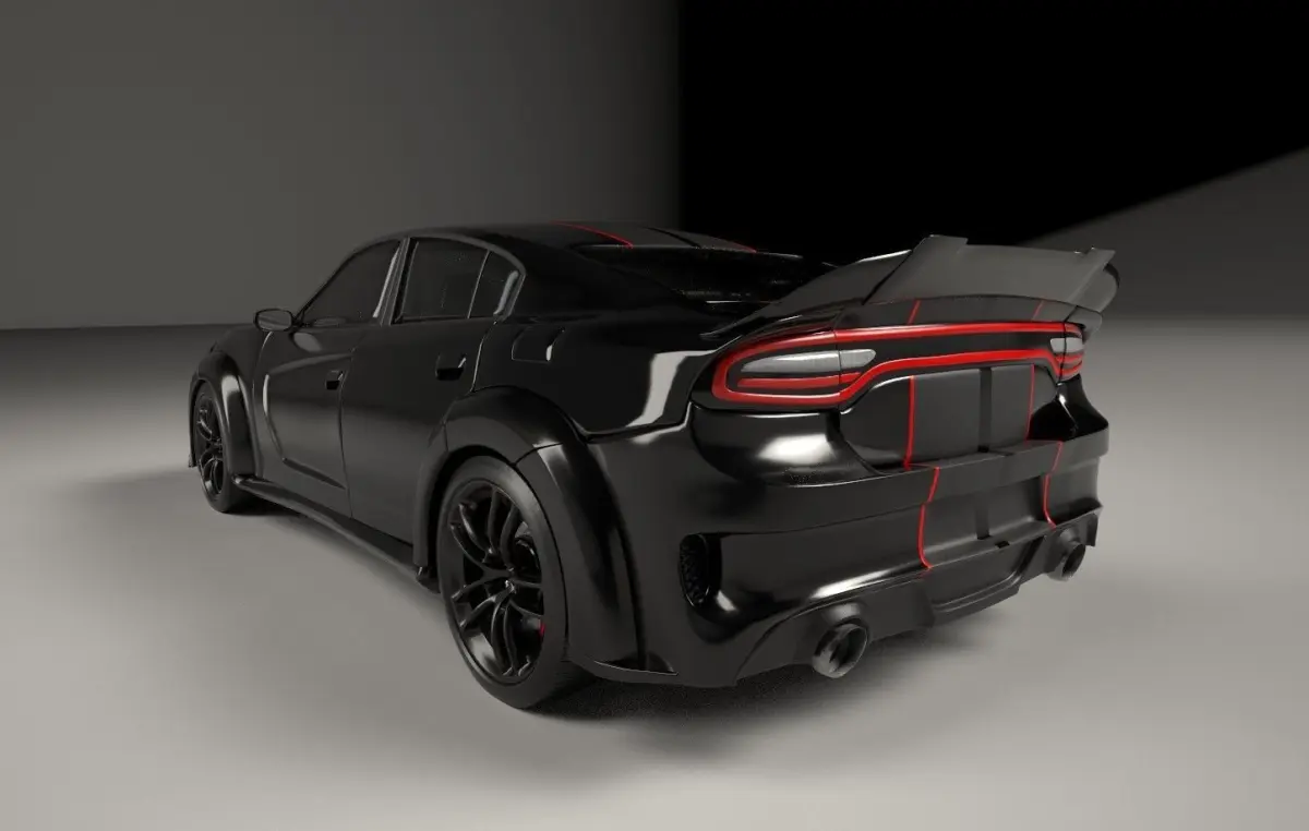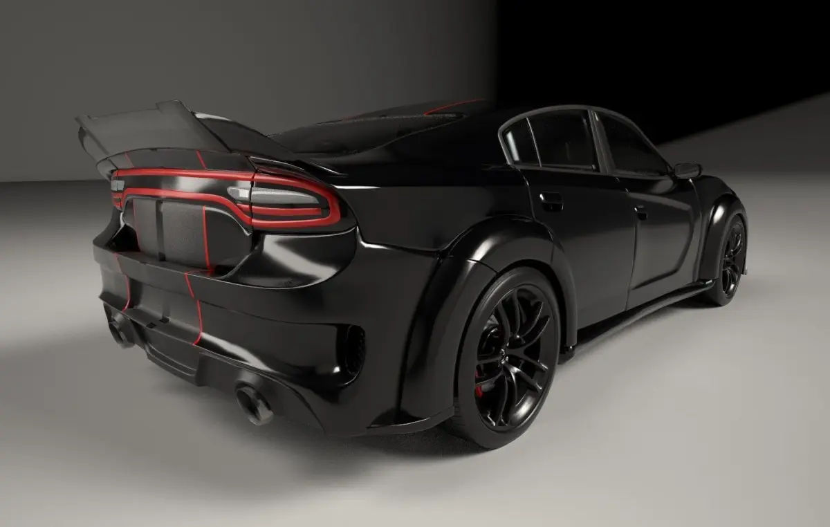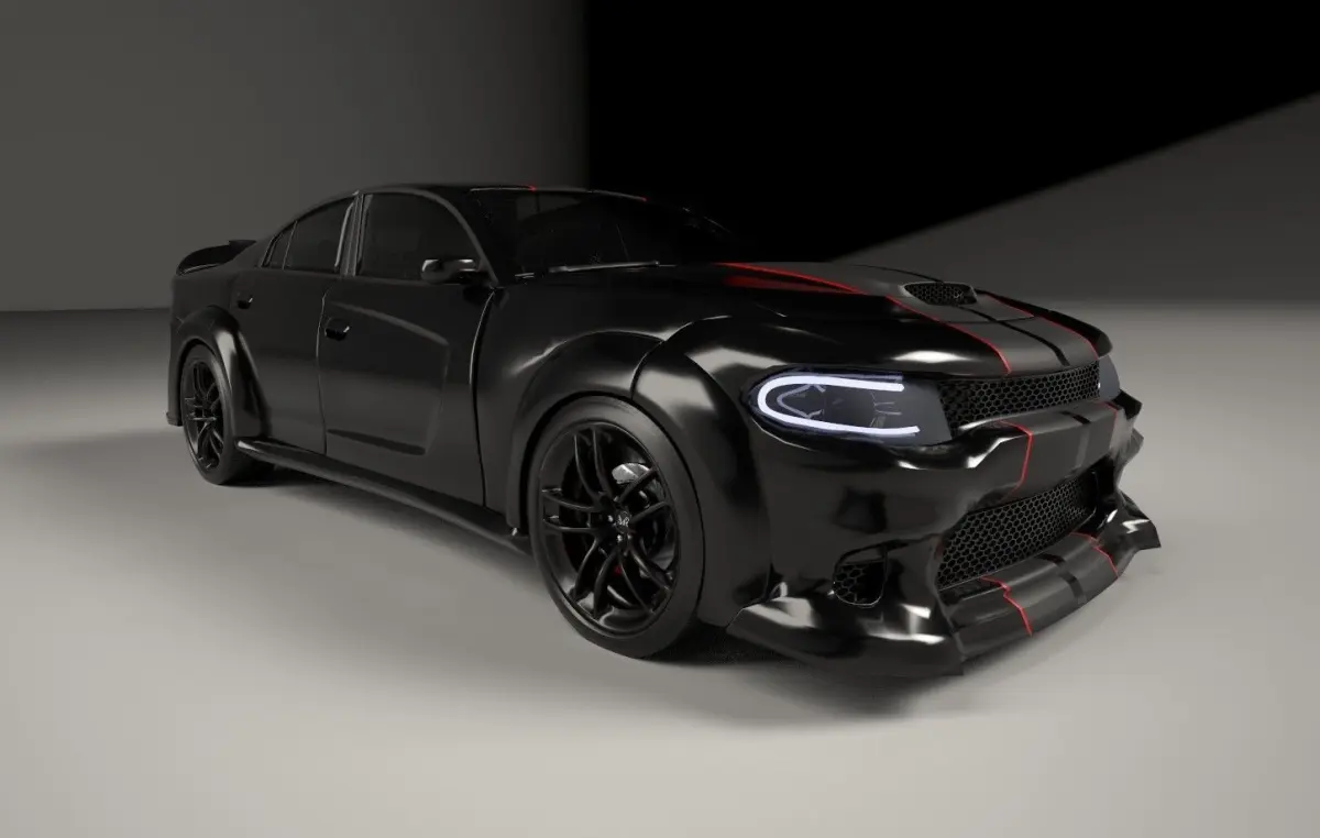 This is a 3d model of an American Muscle Car, black with personalized painting, agressive and powerful visual with a V8 6.2 engine, larger tires, competition brakes, front and back airfoils, custom steerwheel, drinks a lot of gasoline but you have the power in your hands.