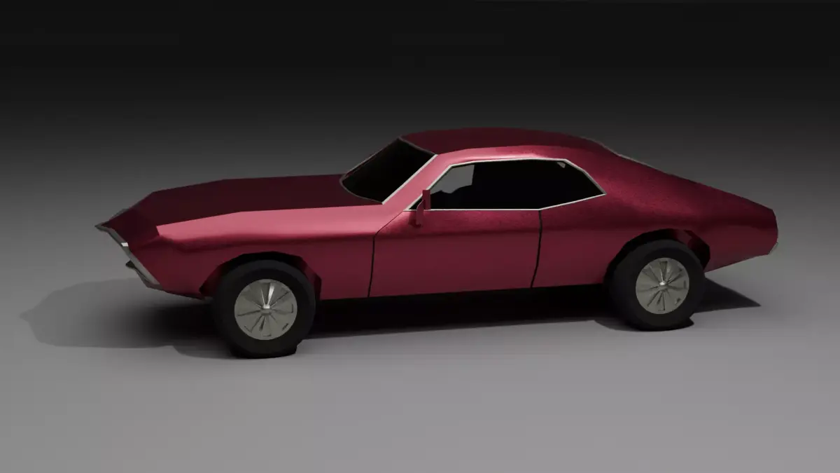 This low-poly 3D car model represents a sleek, stylized interpretation of a classic American muscle car, blending nostalgic automotive design with modern digital optimization. Rendered in a striking deep burgundy metallic finish, the vehicle features a long hood, a swept-back fastback roofline, and an aggressive stance that captures the essence of 1960s and 70s performance heritage. The aesthetic is defined by sharp, intentional geometric lines that provide a distinct low-poly charm while maintaining a sophisticated silhouette. Thoughtful design details, such as the silver-trimmed windows, side mirrors, and glowing rectangular taillights, add layers of depth and realism to the simplified form.