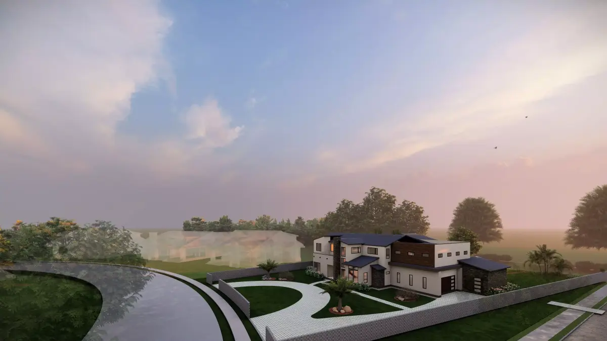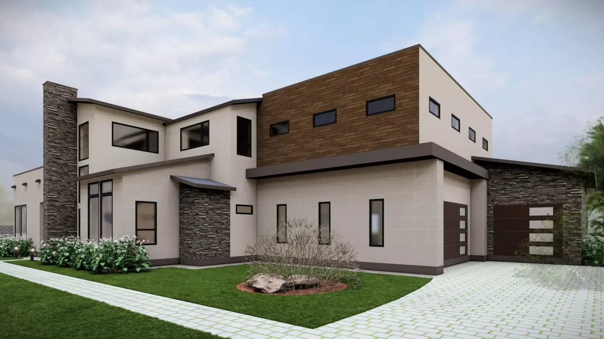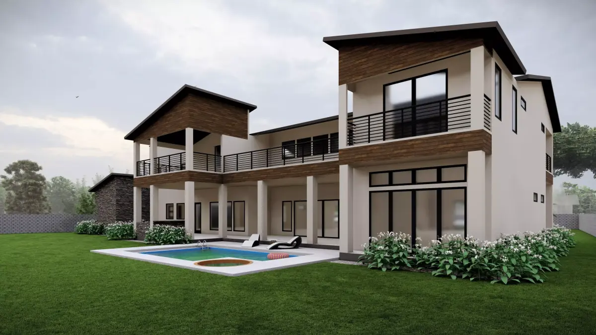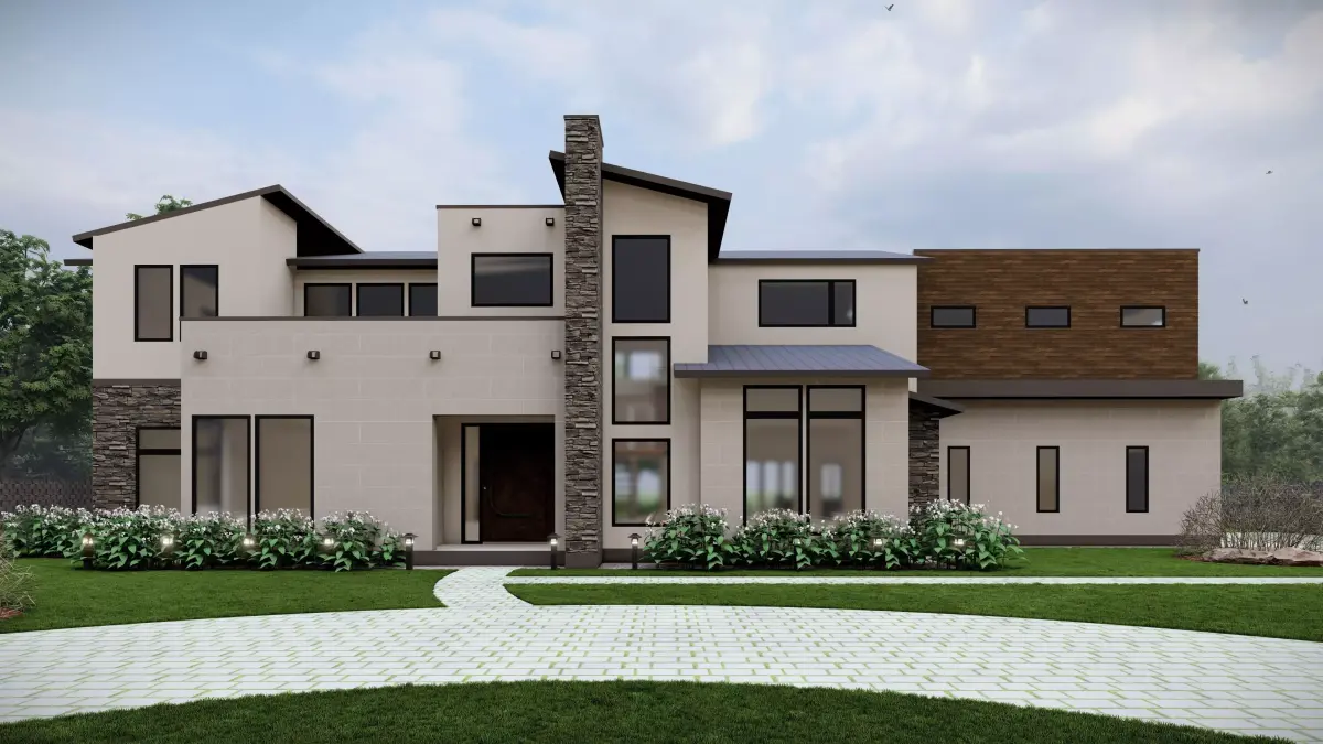 This modern luxury villa is a two-storey 5BHK residence designed with a blend of contemporary aesthetics and natural materials, making it ideal for upscale living. The façade features a sophisticated mix of cream-toned textured stucco, dark stone cladding, and warm wooden panelling, balanced with clean lines and expansive glazing for abundant daylight. A striking vertical stone tower anchors the design, while the cantilevered wooden volume adds depth and character. Inside, the home includes a grand double-height living area, spacious bedrooms with attached bathrooms, a modular kitchen, walk-in wardrobes, and a private home office. Landscaped front lawns, a curved paved walkway, and large corner windows enhance both the visual appeal and functionality, offering seamless indoor-outdoor connectivity and a serene residential experience.