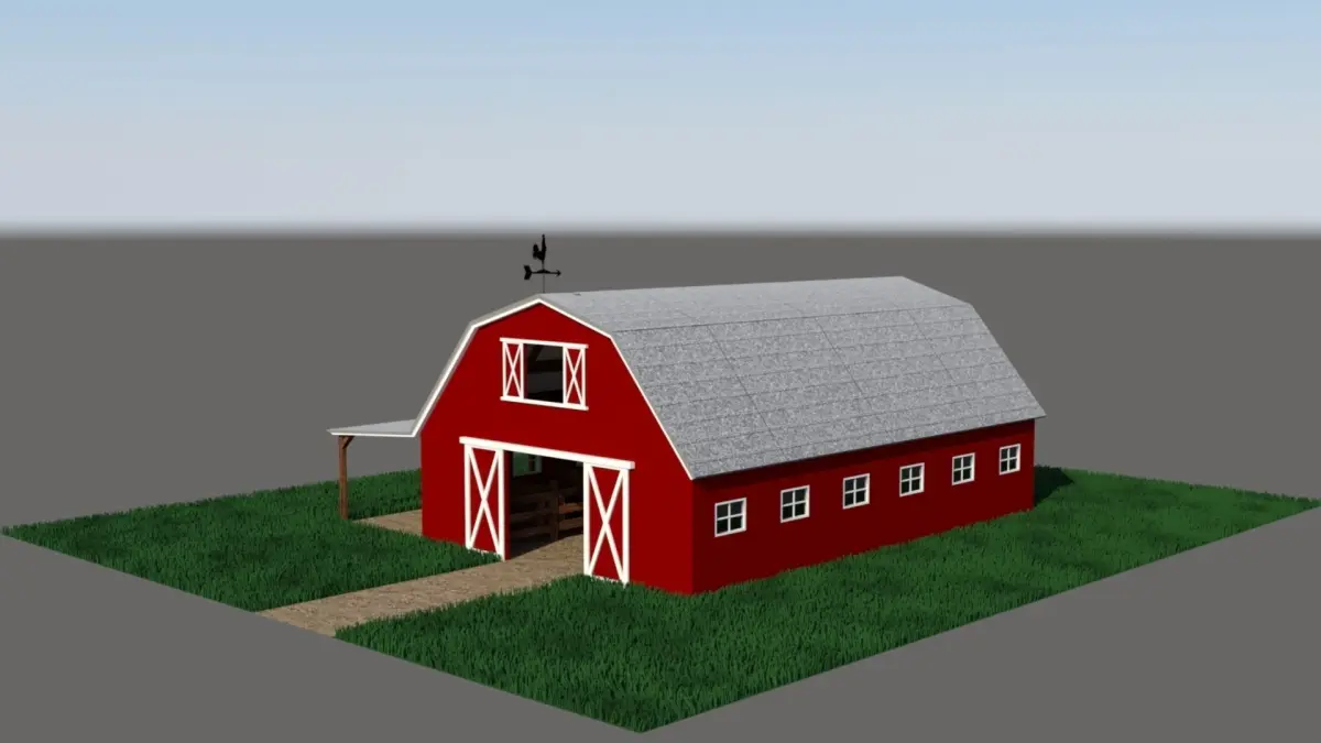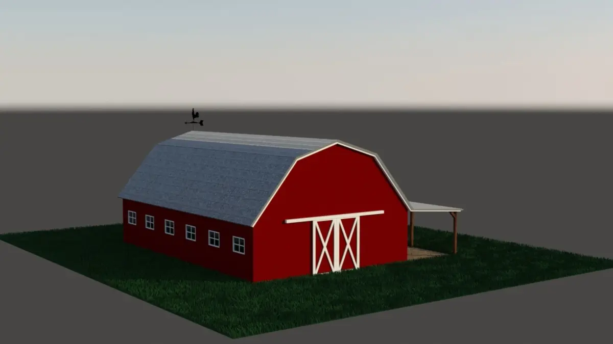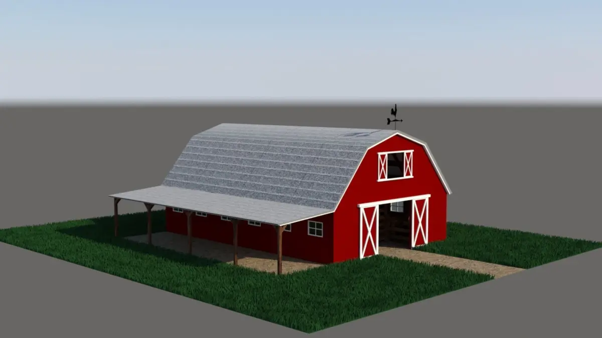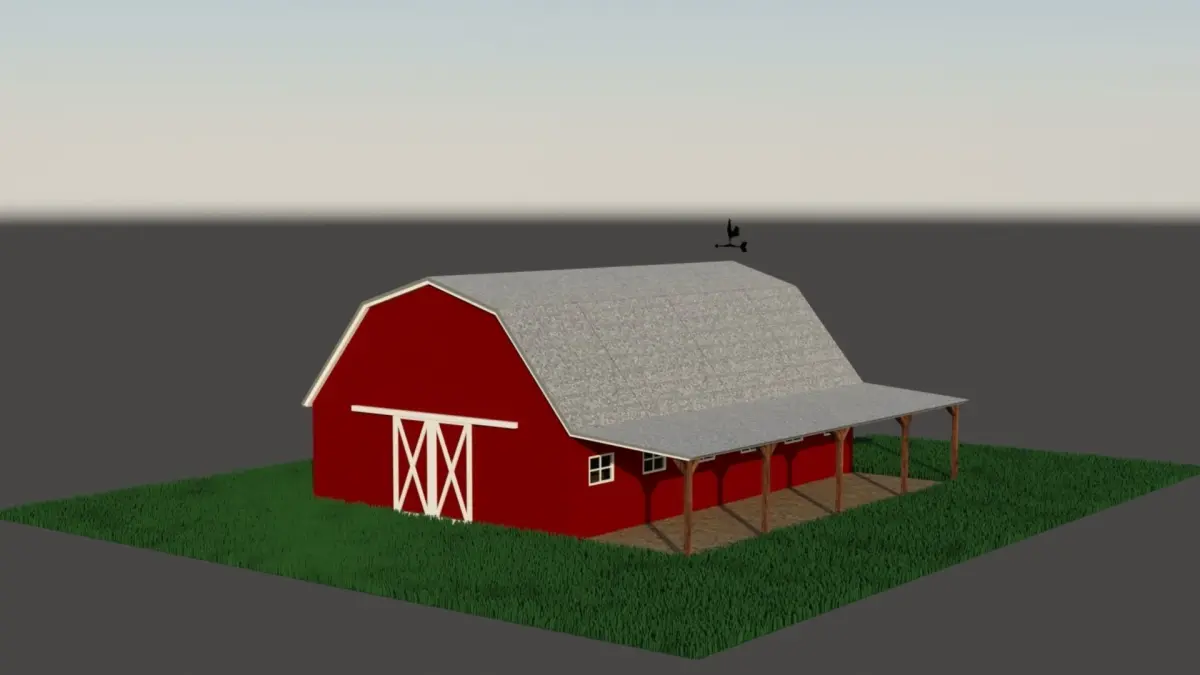American old traditional style barn with side porch roof.The barn has two pairs of large sliding front and rear doors and a small pair of sliding door on the front face top floor for loading items into the top floor storage space.The barn has seperate animal bays each with its own small window and gate.