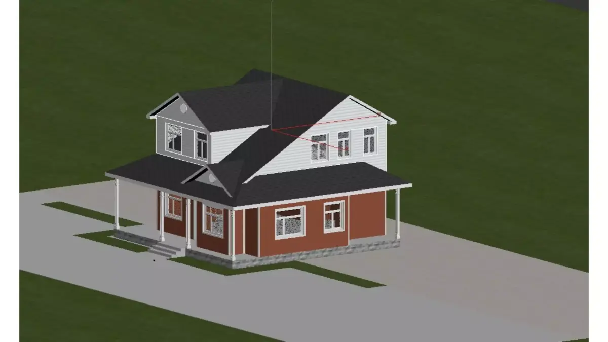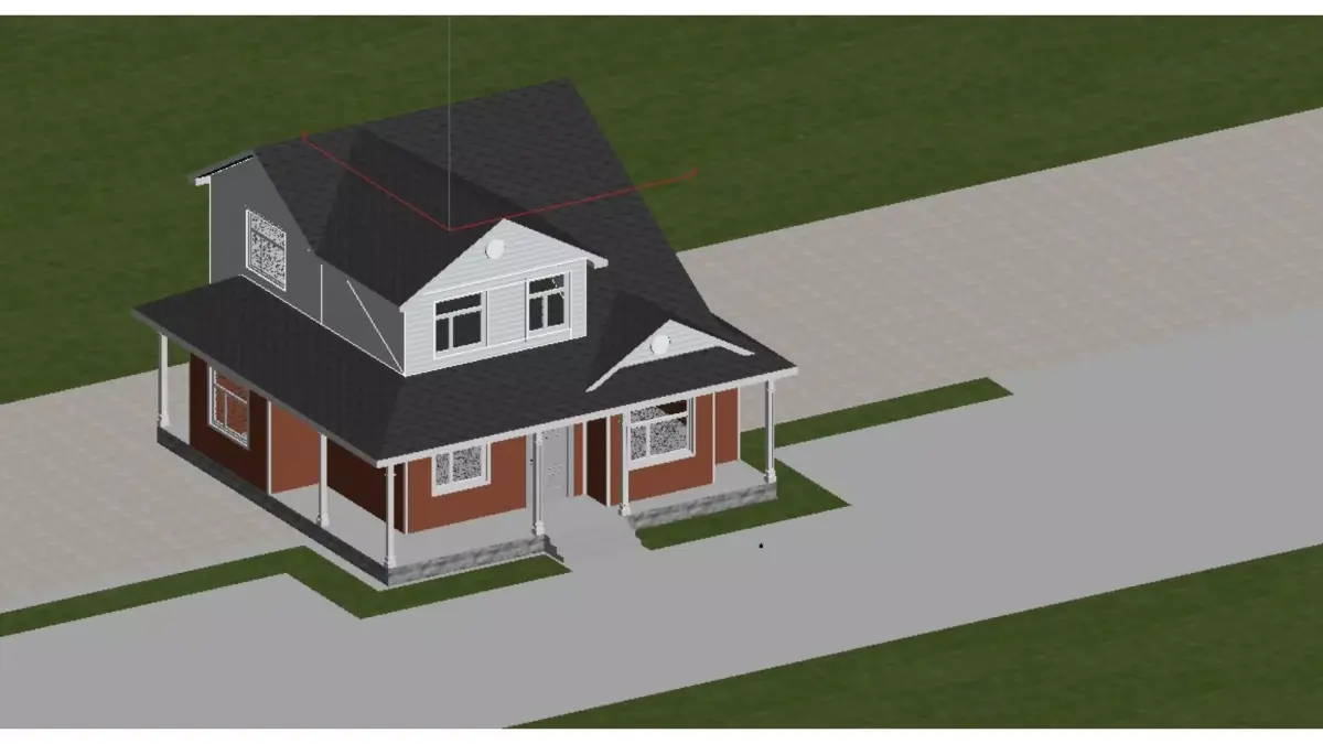 This is a two-story standalone residential building, presenting a warm American countryside style overall:Architectural appearance:The house adopts a dual color exterior wall combination of orange red and white, with orange red wall panels on the lower level, white mountain walls and porch columns on the upper level, and dark gray asphalt tiles on the roof. There is a spacious porch on the front, surrounded by white columns and railings. The entrance door is located in the center of the porch, and there are large-sized white window frames on both sides. There are also two windows on the upper mountain wall, decorated with circular ventilation openings, and the overall lines are simple and bright.Surrounding environment:In front of the house is a gray paved courtyard, with rich landscape plants planted in front and on the sides, including shrubs with white and orange flowers, deep purple ornamental trees, and neatly trimmed hedges. The background is dense forests and clear blue sky. There is a standing character in the bottom left corner of the screen, used to visually display the actual proportions of the house.Overall atmosphere:The rendering features bright lighting and warm colors, presenting a comfortable, livable, and rustic image of a family residence.This tree species is a VR proxy model to reduce the number of faces in the overall model and prevent the model from being too large