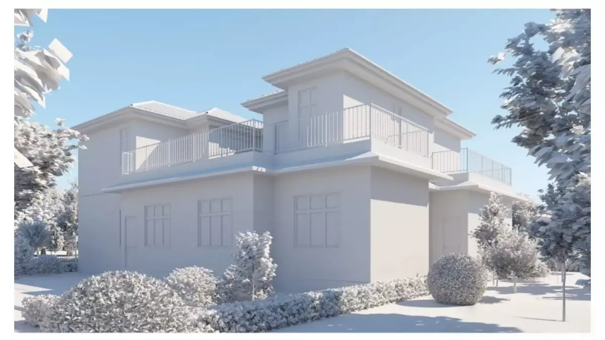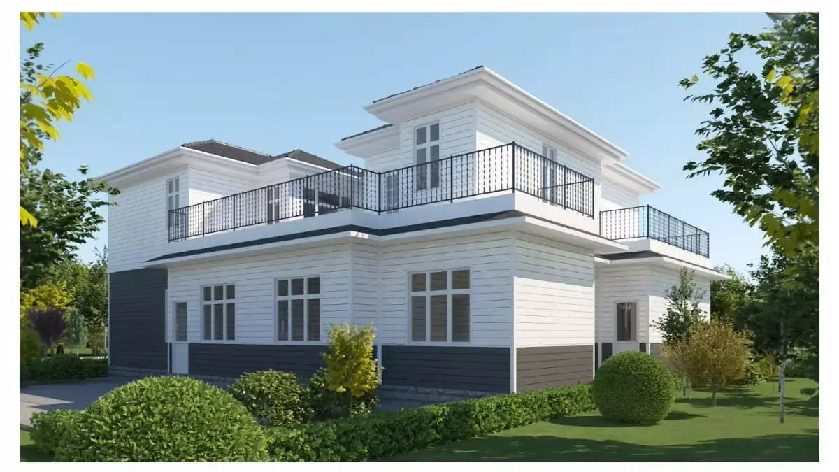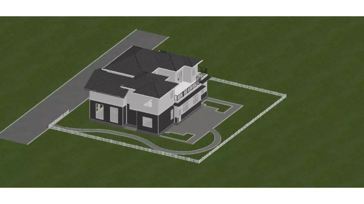 This is a modern American style two-story detached house with a fresh and atmospheric overall design:Architectural appearance:The main body of the house adopts a dual color exterior wall combination of white and dark gray, with white wall panels covering the upper layer and dark gray wall panels used for the lower layer, creating a vivid visual contrast. The roof is made of dark gray tiles, with a prominent gable design on the right side, complemented by large white window frames and multi pane glass windows, providing transparent lighting. On the left side, there is a garage with white double garage doors and a porch with white columns. There is also a small terrace above the porch.Surrounding environment:In front of the house is a gray paved lane, and various green plants are planted in the courtyard in front of the door and on the side, including deep purple ornamental trees, green shrubs, and lawns, separated from the road by a white pointed fence, creating a clean and warm community atmosphere. The background is dense forests and clear blue sky, creating a fresh and natural overall environment.Overall atmosphere:The rendering features bright lighting and clean colors, presenting a comfortable, modern, and vibrant image of an American family home.This tree species is a VR proxy model to reduce the number of faces in the overall model and prevent the model from being too large
