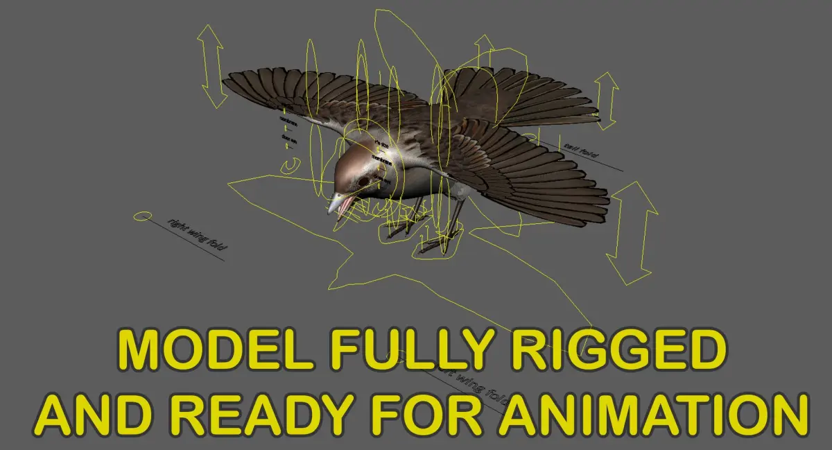 TreeSparrow_Fly1.mb - contains slow motion (x4 times) infinite flying cycle animation (64 frames), you can set any length of your clip, easy to adjust flying position with Main_Control.