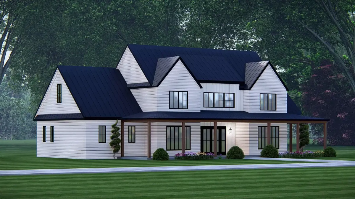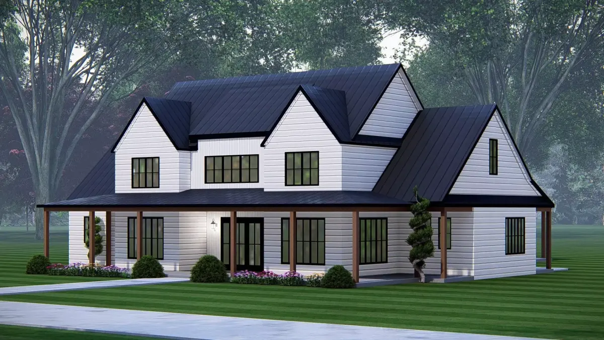 The exterior design features wide porches, rustic wooden textures, pitched roofing, barn-inspired elements, and open layouts that embody the warmth and lifestyle of traditional American homesteads. This versatile house style reflects the perfect balance of rustic charm and modern practicality, making it ideal for both countryside retreats and suburban living concepts.