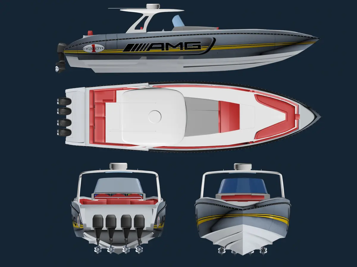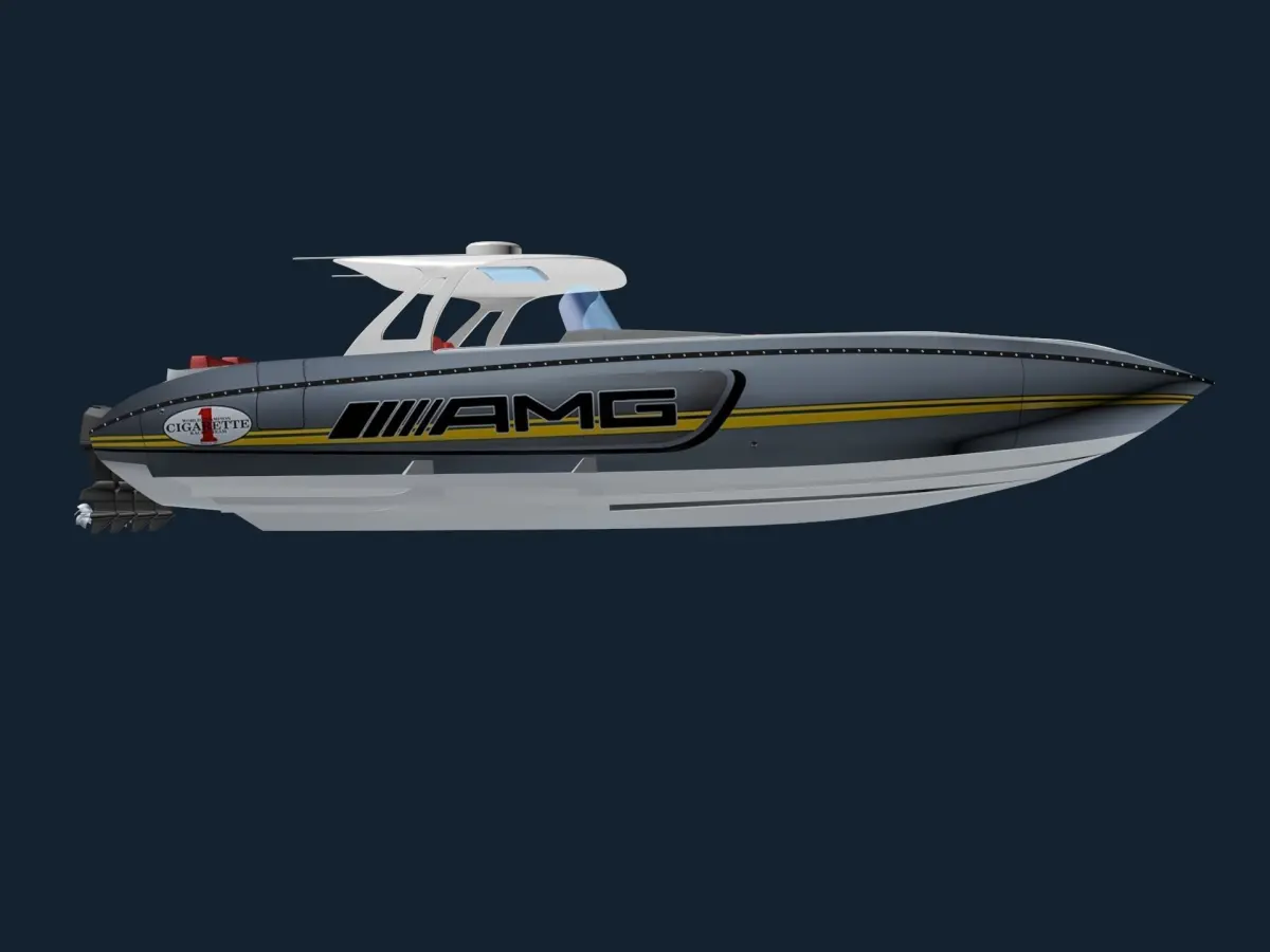 The 3D model of 41-foot AMG Cigarete Speed Boat is a four-motor, 1,600-horsepower, 83 mph ocean rocket.Once beloved of drug runners, bootleggers, smugglers and ne'er-do-wells who used them to out-run the US Coast Guard on dodgy missions between Columbia and the Florida Keys.Cigarette Racing has owned the name since its inception in the mid-60s and is now America's leading brand in the category. 2019 marks 12 years of collaboration between Cigarette and Mercedes-AMG as a joint marketing exercise, which has resulted in the creation of some ferociously fast and impressive machines.
