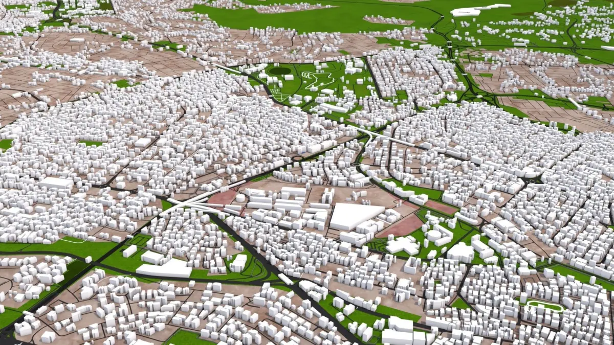 For other 3d applications there are different formats included such as FBX (with materials) , OBJ (with materials) , stl, 3ds, etc. I recommend using OBJ or FBX and import them in your 3d application and reload the textures provided or use your own favourite materials. Replacing the materials is easy because minimum numbers and proper naming. Once loaded you can merge ALEMBIC or DXF file on top of the polygon and can recreate the road, rail, water details or add traffic. Alembic and DXF are 2d files with the curve information only. Check all images before purchasing, if any doubts you can drop a message. You can ask for a specific city also.
