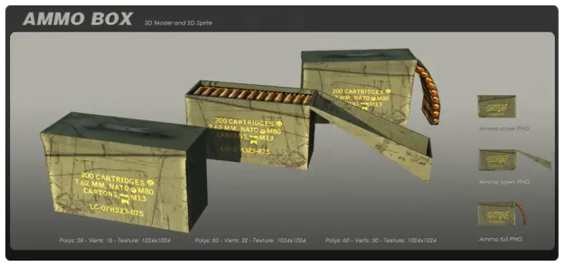 This pack contain three separated 3d models of an ammunitions box.