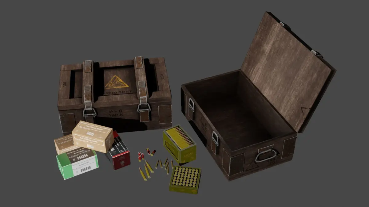The Ammo Box Set contains 7 separate objects and are ready to be rigged or configured.