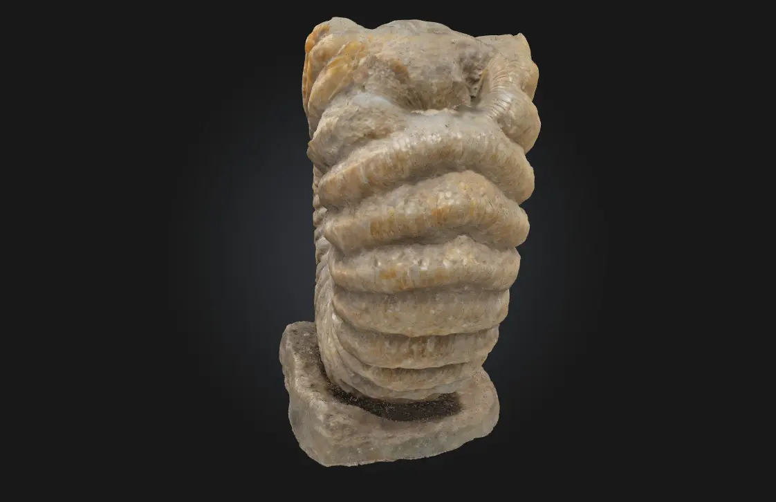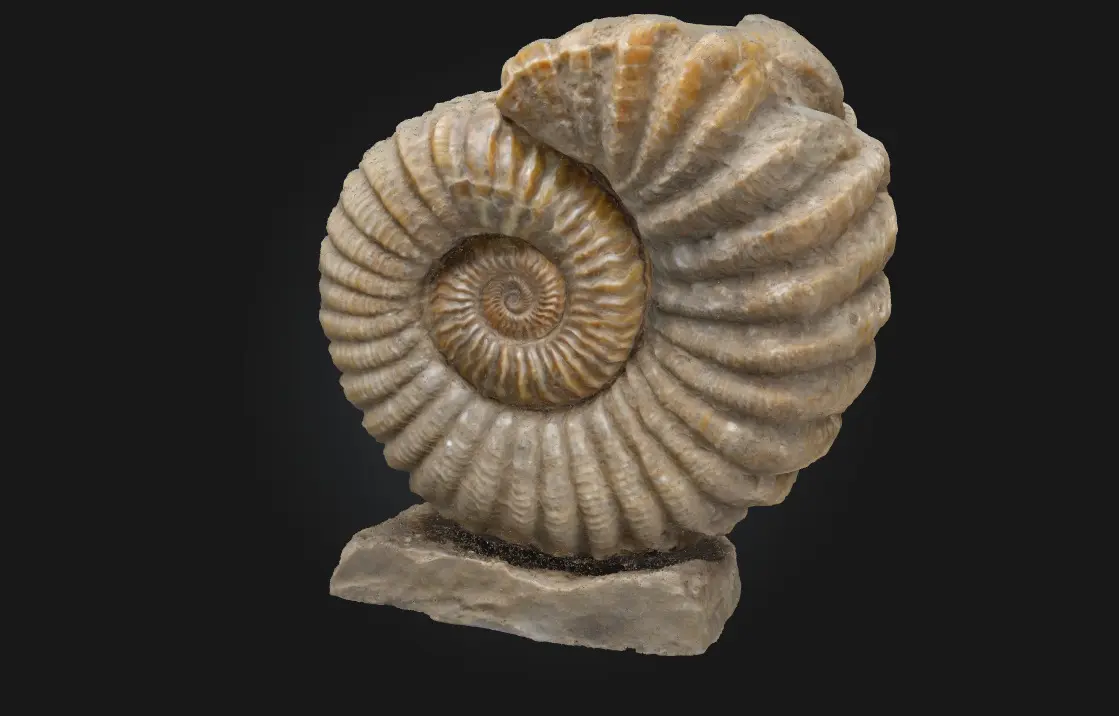 Detailed spiral shell with textured ridges and realistic fossilization effects