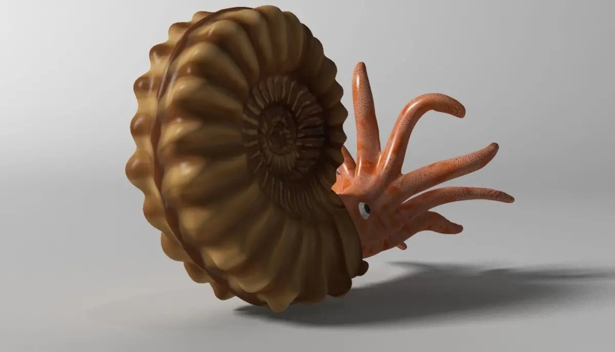mmonites were marine cephalopod molluscs.they first appeared in the early Devonian period.Their widely-known fossils show a ribbed spiral-form shell, in the end compartment of which lived the tentacled animal. These creatures lived in the seas from at least 400 to 65 million years ago. They became extinct at the same time than dinosaur. Their nearest living relatives are the octopus, squid, cuttlefish and Nautilus.