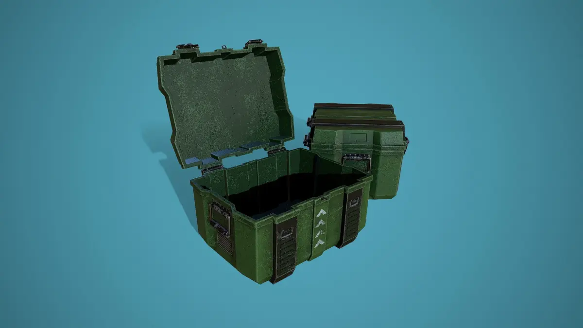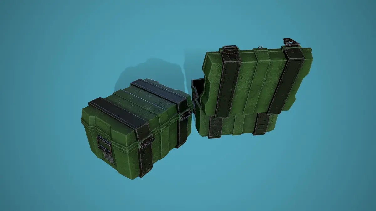 Low poly model of an ammunition box, doesn't contain any n gons, has optimal topology. Archive with 2k textures contains such maps: -Base color map -Metallic map -Normal map (OpenGL) -Roughness map. Model rendered in Marmoset.