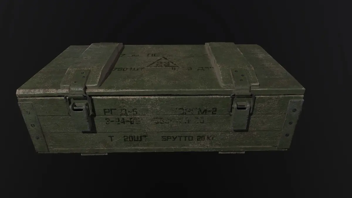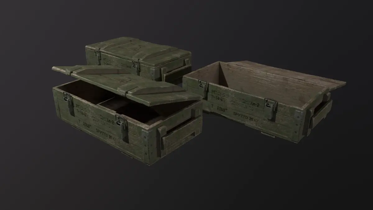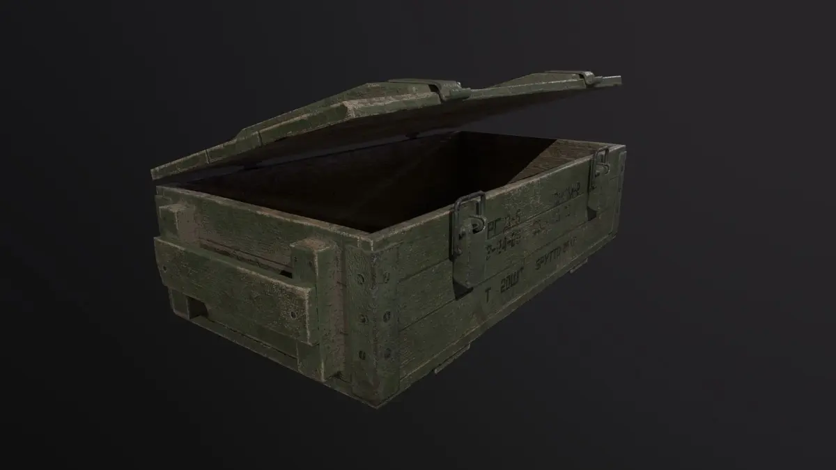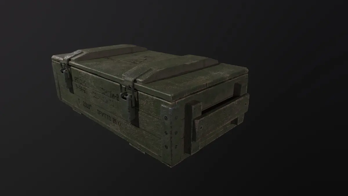 Game ready 3D model: Ammunition box, PBR texture 1.rar ( UE4- BaseColor, Normal, OcclusionRoughnessMetallic) 4096x4096. 2.rar (Metal_roughness- Base_Color, Height, Metallic, AO, Normal_OpenGL, Roughness) 4096x4096. Polys: 1 621Verts: 1 607